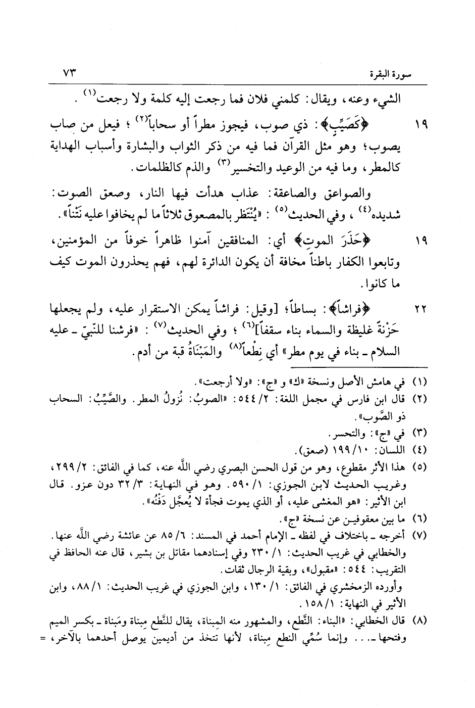 19 كَصَيِّبٍ: ذي صوب، فيجوز مطرا أو سحابا «2» فيعل من صاب يصوب وهو مثل القرآن فما فيه من ذكر الثواب والبشارة وأسباب الهداية كالمطر، وما فيه من الوعيد والتخسير «3» والذم كالظلمات.