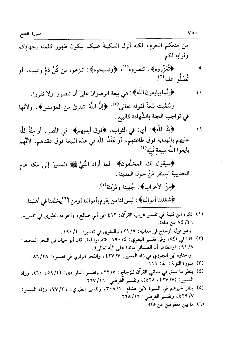 9 تُعَزِّرُوهُ: تنصروه «1» ، وَتُسَبِّحُوهُ: تنزهوه من كلّ ذمّ وعيب، أو تصلّوا عليه «2» .