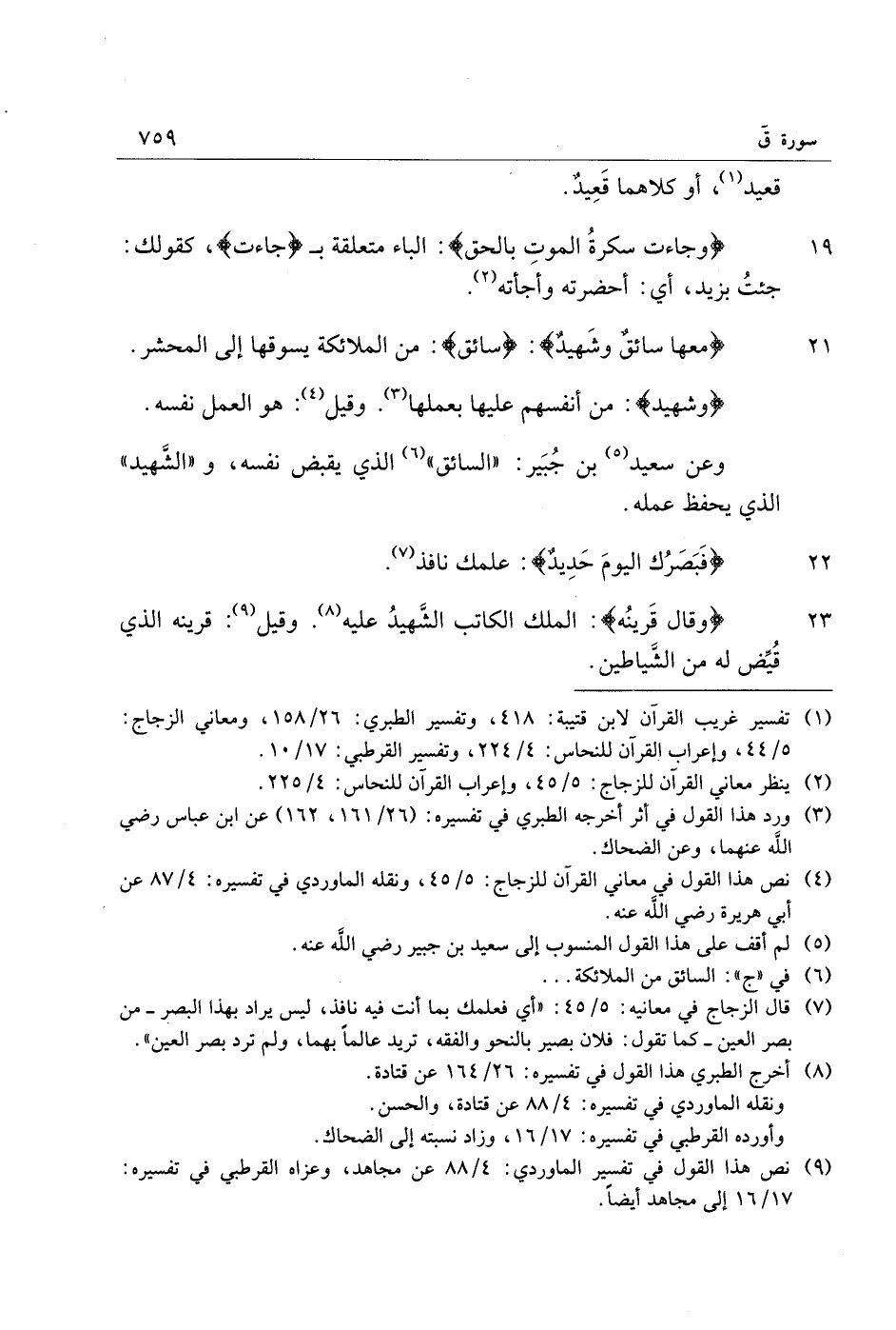 وعن سعيد «5» بن جبير: «السائق» «6» الذي يقبض نفسه، و «الشّهيد» الذي يحفظ عمله.