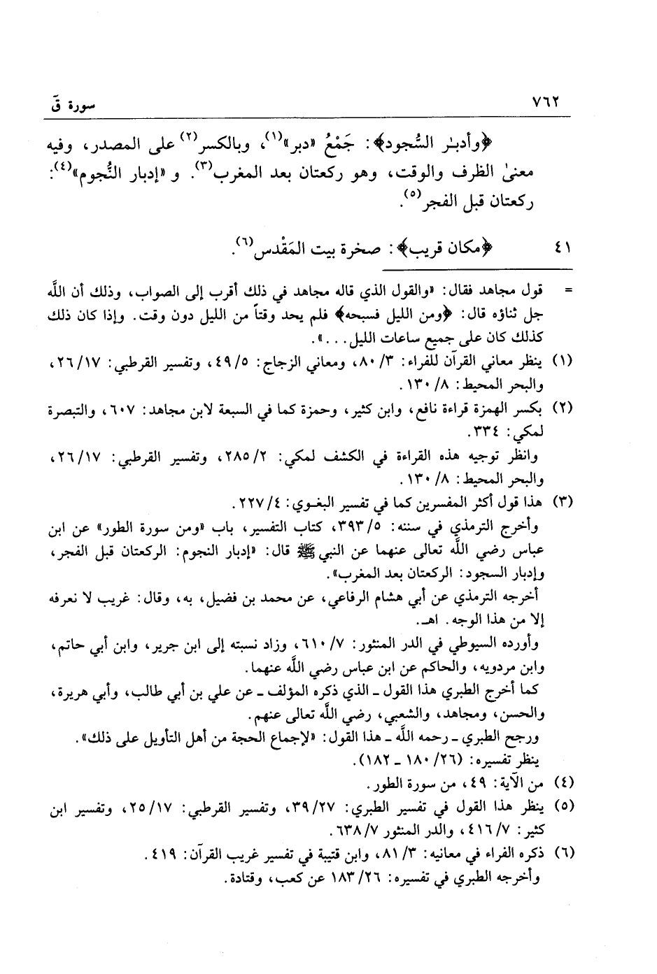وَأَدْبارَ السُّجُودِ: جمع «دبر» «1» ، وبالكسر «2» على المصدر، وفيه معنى الظرف والوقت، وهو ركعتان بعد المغرب «3» . و «إدبار النّجوم» «4» :