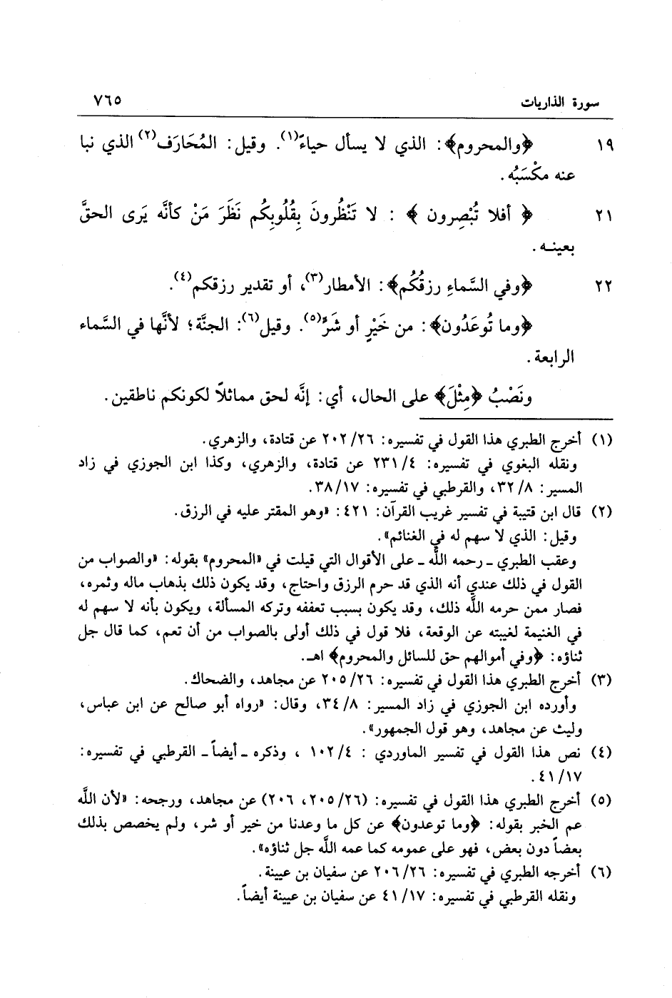 وعقب الطبري- رحمه الله- على الأقوال التي قيلت في «المحروم» بقوله: «والصواب من القول في ذلك عندي أنه الذي قد حرم الرزق واحتاج، وقد يكون ذلك بذهاب ماله وثمره، فصار ممن حرمه الله ذلك، وقد يكون بسبب تعففه وتركه المسألة، ويكون بأنه لا سهم له في الغنيمة لغيبته عن الوقعة، فلا قول في ذلك أولى بالصواب من أن تعم، كما قال جل ثناؤه: وَفِي أَمْوالِهِمْ حَقٌّ لِلسَّائِلِ وَالْمَحْرُومِ اه-.