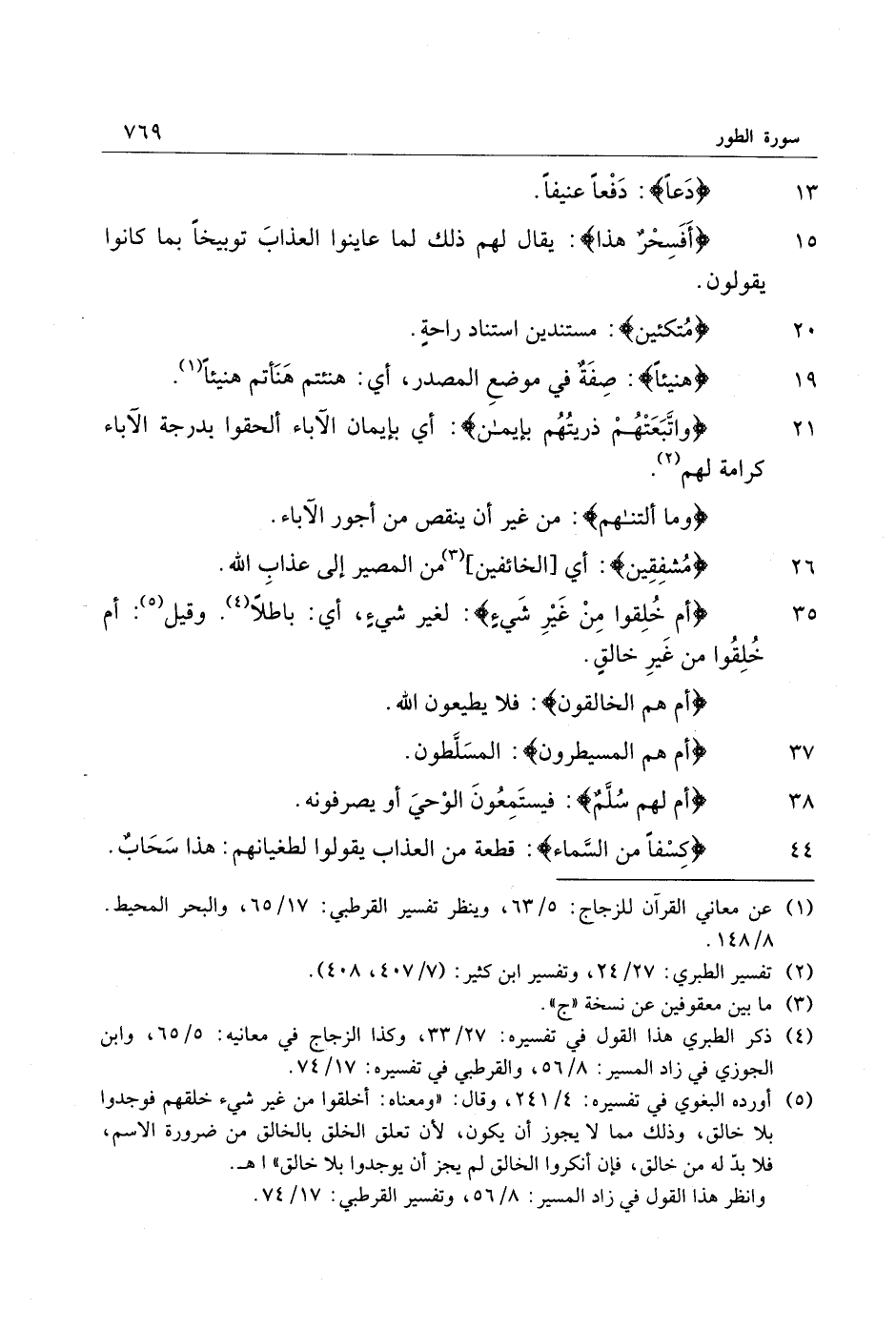 (5) أورده البغوي في تفسيره: 4/ 241، وقال: «ومعناه: أخلقوا من غير شيء خلقهم فوجدوا بلا خالق، وذلك مما لا يجوز أن يكون، لأن تعلق الخلق بالخالق من ضرورة الاسم، فلا بدّ له من خالق، فإن أنكروا الخالق لم يجز أن يوجدوا بلا خالق» اه-.