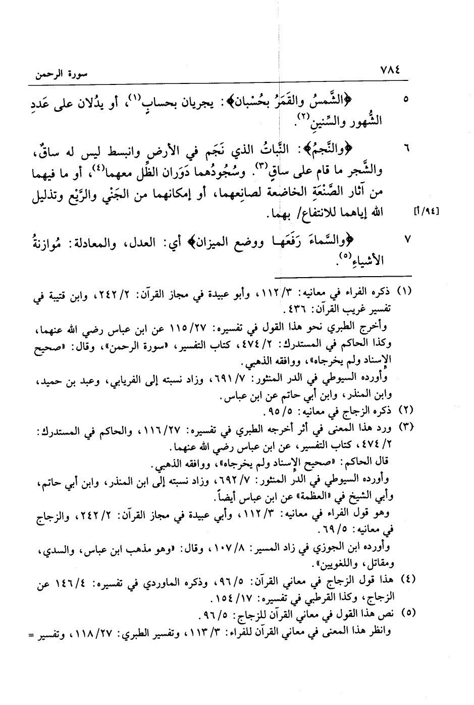 5 الشَّمْسُ وَالْقَمَرُ بِحُسْبانٍ: يجريان بحساب «1» ، أو يدلان على عدد الشّهور والسّنين «2» .