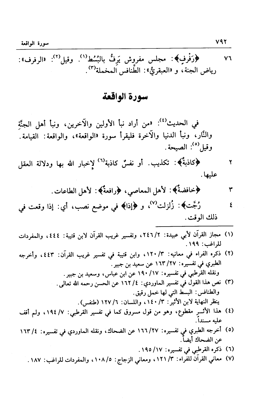 في الحديث «4» : «من أراد نبأ الأولين والآخرين، ونبأ أهل الجنّة والنّار، ونبأ الدنيا والآخرة فليقرأ سورة «الواقعة» ، والواقعة: القيامة.