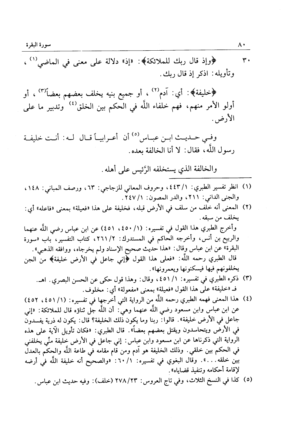 (4) هذا المعنى فهمه الطبري رحمه الله من الرواية التي أخرجها في تفسيره: (1/ 451، 452) عن ابن عباس وابن مسعود رضي الله عنهما وهي: أن الله جل ثناؤه قال للملائكة: «إني جاعل في الأرض خليفة» . قالوا: ربنا وما يكون ذلك الخليفة؟ قال: يكون له ذرية يفسدون في الأرض ويتحاسدون ويقتل بعضهم بعضا» . قال الطبري: «فكان تأويل الآية على هذه الرواية التي ذكرناها عن ابن مسعود وابن عباس: إنّي جاعل في الأرض خليفة منّي يخلفني في الحكم بين خلقي. وذلك الخليفة هو آدم ومن قام مقامه في طاعة الله والحكم بالعدل بين خلقه ... » . وقال البغوي في تفسيره: 1/ 60: «والصحيح أنه خليفة الله في أرضه لإقامة أحكامه وتنفيذ قضاياه» . [.....]