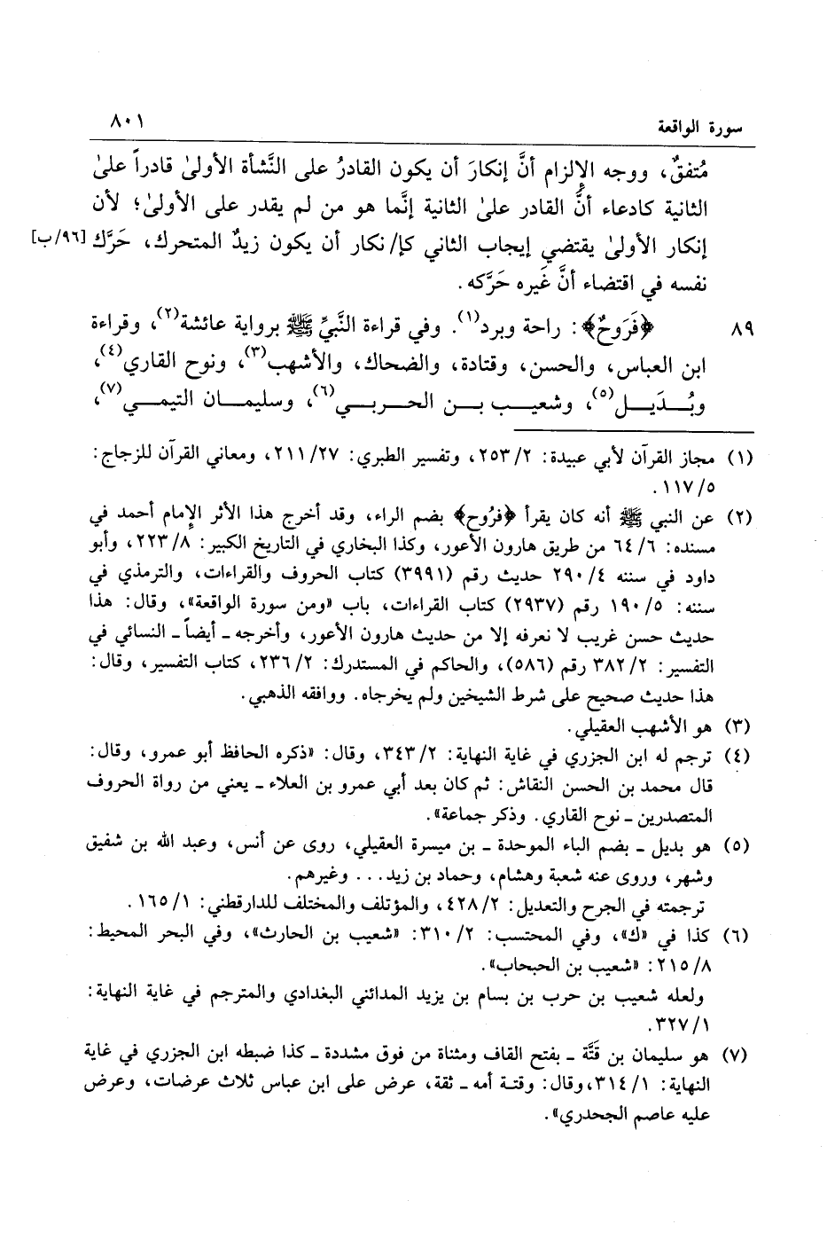 (2) عن النبي صلى الله عليه وسلم أنه كان يقرأ فَرَوْحٌ بضم الراء، وقد أخرج هذا الأثر الإمام أحمد في مسنده: 6/ 64 من طريق هارون الأعور، وكذا البخاري في التاريخ الكبير: 8/ 223، وأبو داود في سننه 4/ 290 حديث رقم (3991) كتاب الحروف والقراءات، والترمذي في سننه: 5/ 190 رقم (2937) كتاب القراءات، باب «ومن سورة الواقعة» ، وقال: هذا حديث حسن غريب لا نعرفه إلا من حديث هارون الأعور، وأخرجه- أيضا- النسائي في التفسير: 2/ 382 رقم (586) ، والحاكم في المستدرك: 2/ 236، كتاب التفسير، وقال: