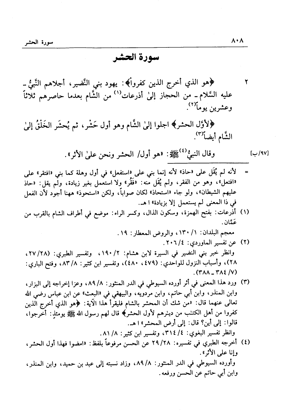 (4) أخرجه الطبري في تفسيره: 28/ 29 عن الحسن مرفوعا بلفظ: «امضوا فهذا أول الحشر، وإنا على الأثر» .