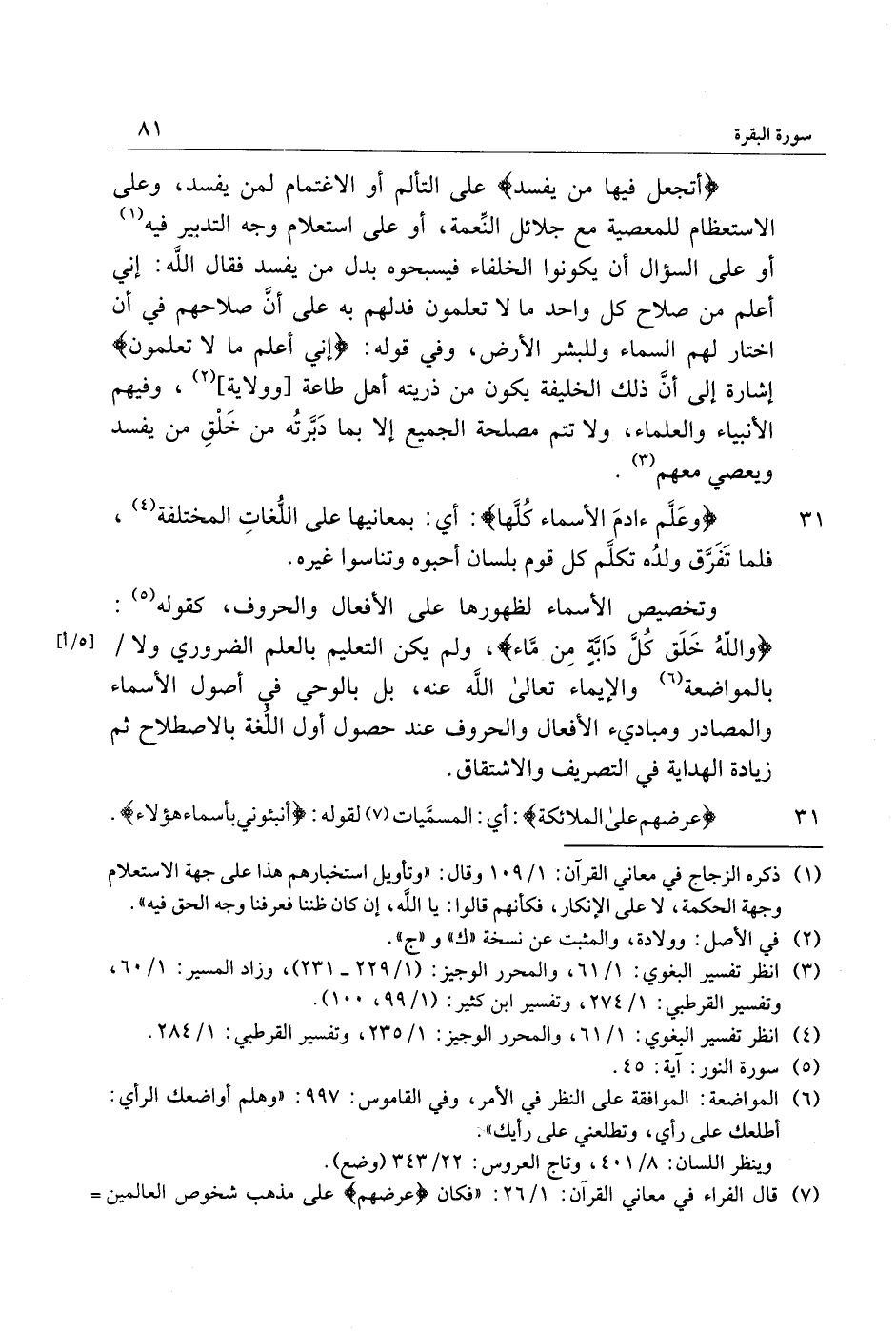 31 عَرَضَهُمْ عَلَى الْمَلائِكَةِ: أي: المسمّيات «7» لقوله: أَنْبِئُونِي بِأَسْماءِ هؤُلاءِ.
