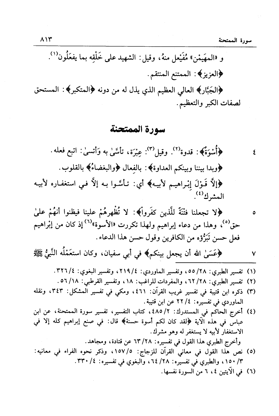 (4) أخرج الحاكم في المستدرك: 2/ 485، كتاب التفسير، تفسير سورة الممتحنة، عن ابن عباس في هذه الآية قَدْ كانَتْ لَكُمْ أُسْوَةٌ حَسَنَةٌ قال: في صنع إبراهيم كله إلا في الاستغفار لأبيه لا يستغفر له وهو مشرك.