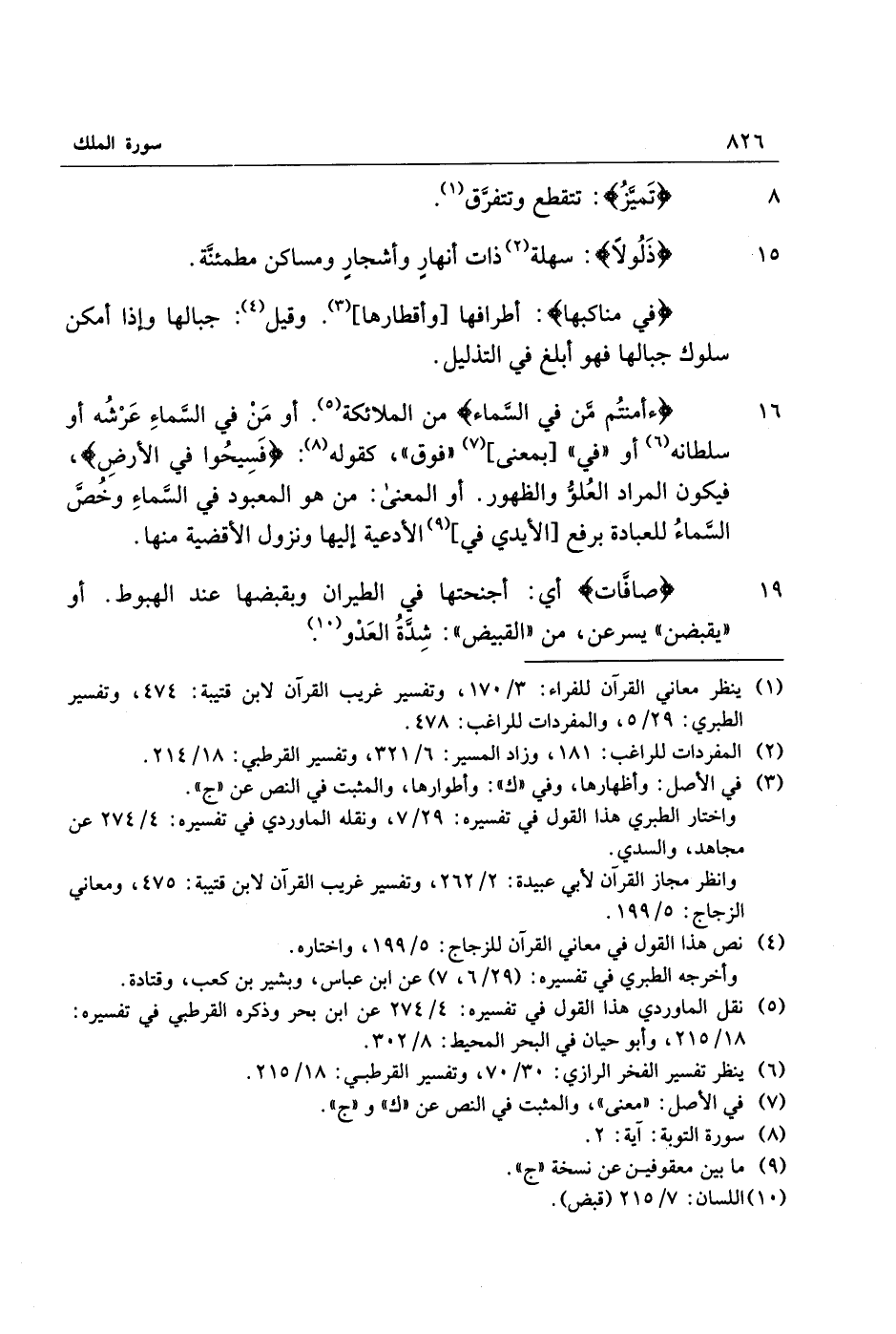 19 صافَّاتٍ أي: أجنحتها في الطيران وبقبضها عند الهبوط. أو «يقبضن» يسرعن، من «القبيض» : شدّة العدو «10» .