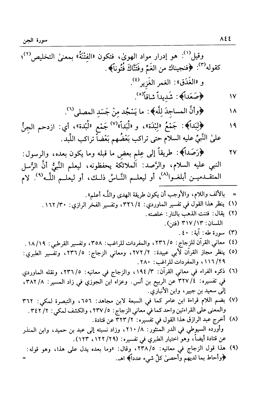19 لِبَداً: جمع «لبدة» ، و «لبدا» «7» جمع «لبدة» ، أي: ازدحم الجنّ على النّبيّ عليه السلام حتى تراكب بعضهم بعضا تراكب اللّبد.