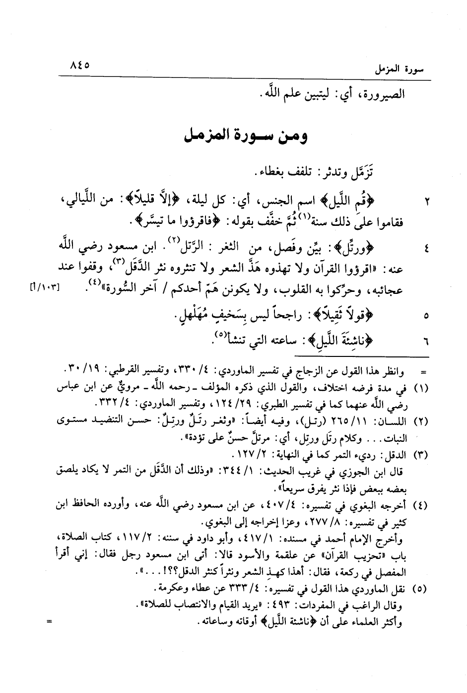 4 وَرَتِّلِ: بيّن وفصل، من الثغر: الرّتل «2» . ابن مسعود رضي الله عنه: «اقرءوا القرآن ولا تهذوه هذّ الشعر ولا تنثروه نثر الدّقل «3» ، وقفوا عند عجائبه، وحرّكوا به القلوب، ولا يكونن همّ أحدكم/ آخر السّورة» «4» . [103/ أ]