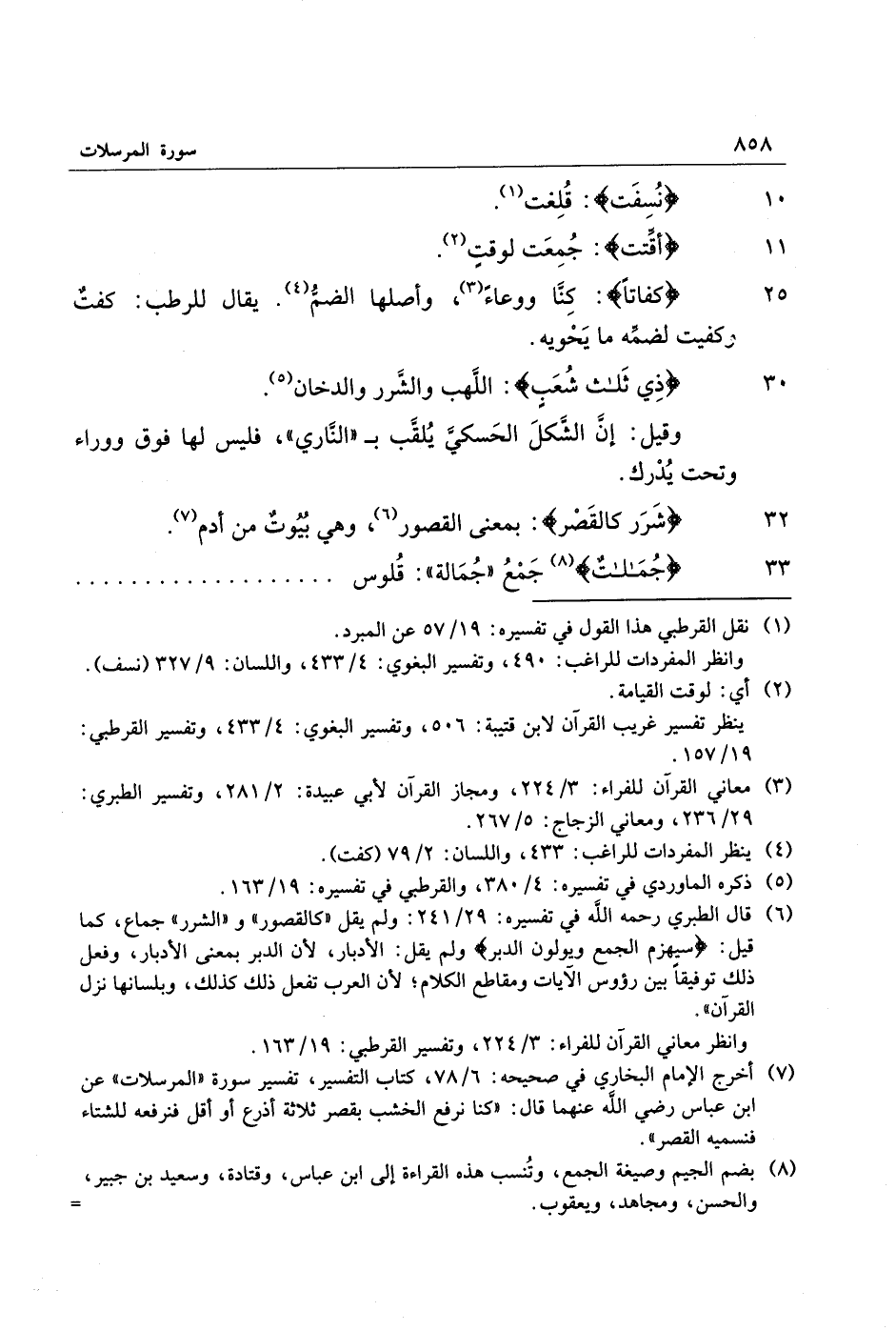 (7) أخرج الإمام البخاري في صحيحه: 6/ 78، كتاب التفسير، تفسير سورة «المرسلات» عن ابن عباس رضي الله عنهما قال: «كنا نرفع الخشب بقصر ثلاثة أذرع أو أقل فنرفعه للشتاء فنسميه القصر» .