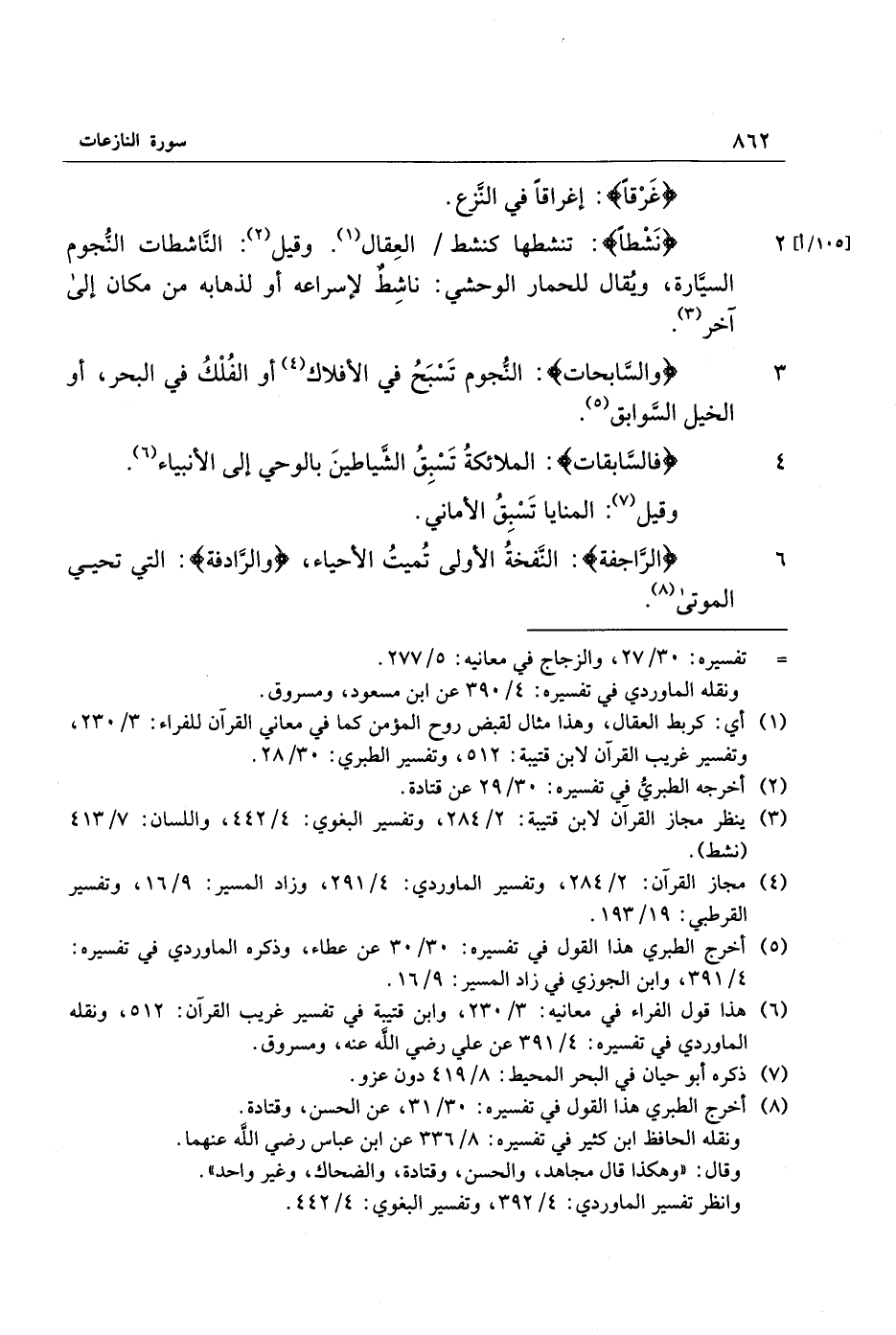 [105/ أ] 2 نَشْطاً: تنشطها كنشط/ العقال «1» . وقيل «2» : النّاشطات النّجوم السيّارة، ويقال للحمار الوحشي: ناشط لإسراعه أو لذهابه من مكان إلى آخر «3» .