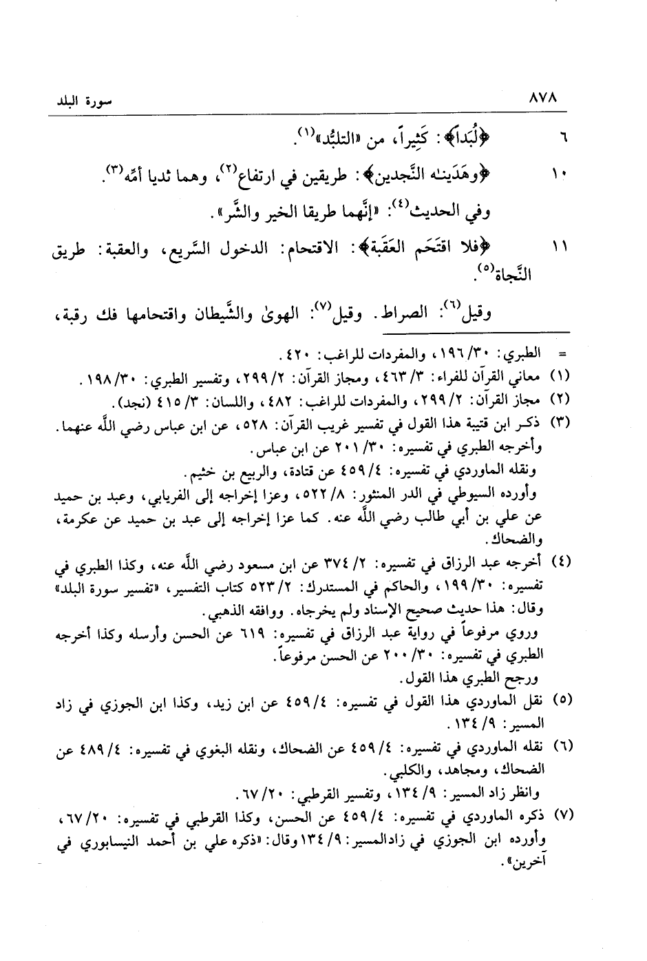 (4) أخرجه عبد الرزاق في تفسيره: 2/ 374 عن ابن مسعود رضي الله عنه، وكذا الطبري في تفسيره: 30/ 199، والحاكم في المستدرك: 2/ 523 كتاب التفسير، «تفسير سورة البلد» وقال: هذا حديث صحيح الإسناد ولم يخرجاه. ووافقه الذهبي.