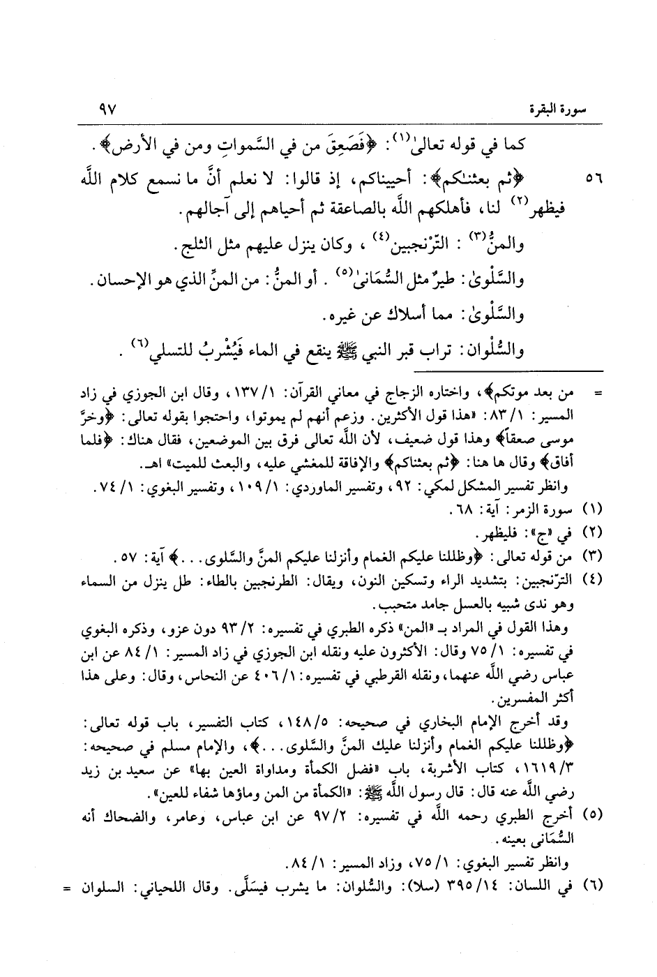 وَظَلَّلْنا عَلَيْكُمُ الْغَمامَ وَأَنْزَلْنا عَلَيْكُمُ الْمَنَّ وَالسَّلْوى ... ، والإمام مسلم في صحيحه: