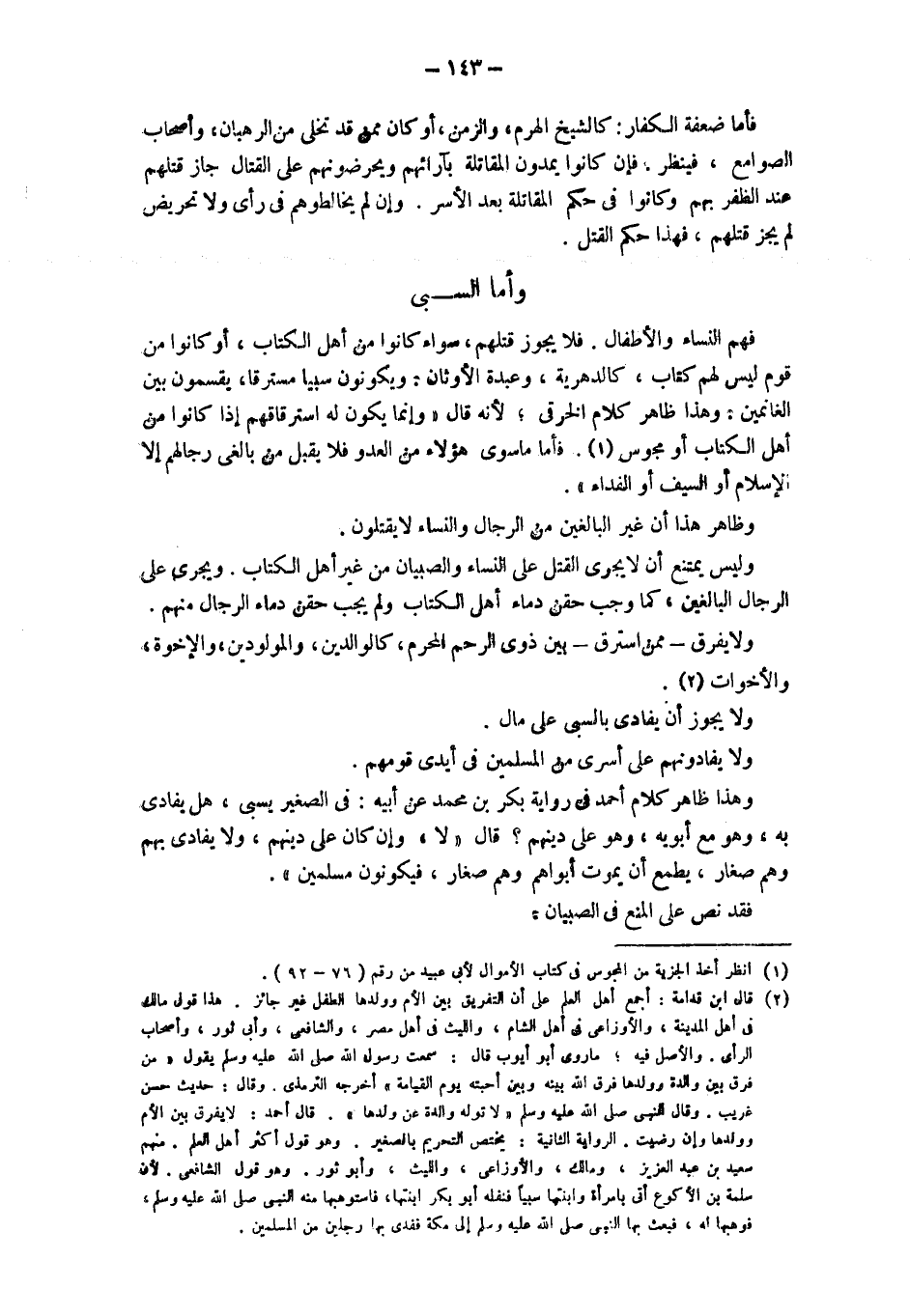 فأما ضعفة الكفار: كالشيخ الهرم، والزمن، أو كان ممن قد تخلى من الرهبان، وأصحاب الصوامع، فينظر، فإن كانوا يمدون المقاتلة بآرائهم وَيُحَرِّضُونَهُمْ عَلَى الْقِتَالِ جَازَ قَتْلُهُمْ عِنْدَ الظَّفَرِ بِهِمْ وَكَانُوا فِي حُكْمِ الْمُقَاتِلَةِ بَعْدَ الْأَسْرِ، وَإِنْ لَمْ يُخَالِطُوهُمْ فِي رَأْيٍ وَلَا تَحْرِيضٍ لم يجز قتلهم، فهذا حكم القتل. وَأَمَّا السَّبْيُ فَهُمْ النِّسَاءُ وَالْأَطْفَالُ. فَلَا يَجُوزُ قتلهم، سواء كانوا من أهل الكتاب، أو كانوا مِنْ قَوْمٍ لَيْسَ لَهُمْ كِتَابٌ، كَالدَّهْرِيَّةِ، وَعَبَدَةِ الأوثان. ويكونون سبيا مسترقا، يقسمون بين الغانمين , وهذا ظاره كلام الخرقي؛ لأنه قال " وإنما يكون له استراقاقهم إذا كانوا من أهل الكتاب أو مجوس. فأما ما سوى هؤلاء من العدو فلا يقبل من بالغي رجالهم إلا الإسلام أو السيف أو الفداء". وظاهر هذا أن غير البالغين من الرجال والنساء لا يقتلون. وليس يمتنع أن لا يجري القتل على النساء والصبيان من غير أهل الكتاب. ويجري على الرجال والبالغين، كما وجب حقن دماء أهل الكتاب ولم يجب حقن دماء الرجال منهم.