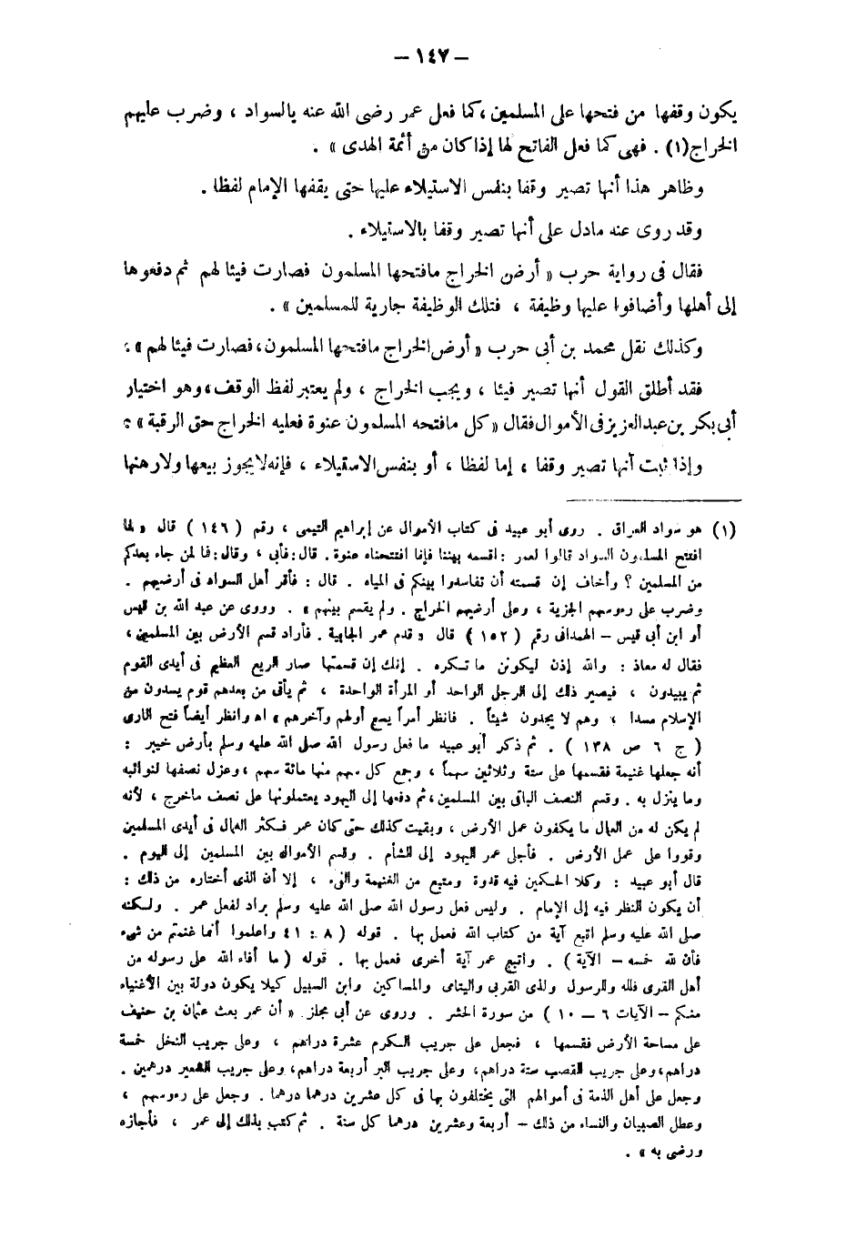 وكذلك نقل محمد بن أبي حرب " أرض الخراج ما فتحها المسلمون، فصارت فيئا لهم". فقد أطلق القول أنها تصير فيئا، ويجب الخراج، ولم يعتبر لفظ الوقف، وهو اختيار أبي بكر بن عبد العزيز في الأموال فقال " كل ما فتحه المسلمون عنوة فعليه الخراج حق الرقبة". وإذا ثبت أنها تصير وقفا، إما لفظا، أو بنفس الاستيلاء، فإنه لا يجوز بيعها ولا رهنها.