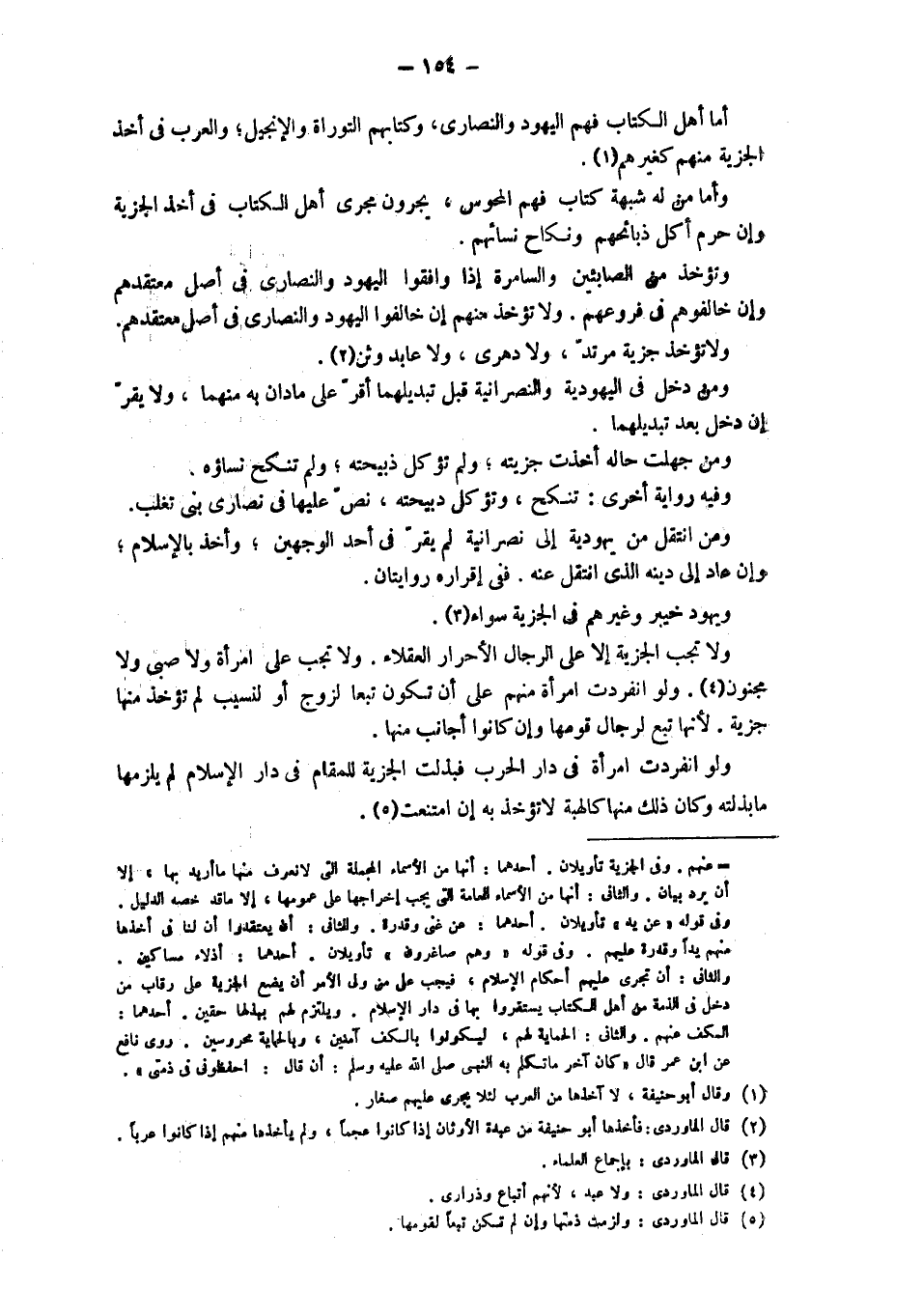 أما أهل الكتاب فهم اليهود والنصارى، وكتابهم التوراة والإنجيل؛ والعرب في أخذ الجزية منهم كغيرهم. وأما من له شبهة كتاب فهم المجوس، يجرون مجرى أهل الكتاب في أخذ الجزية وَإِنْ حَرُمَ أَكْلُ ذَبَائِحِهِمْ وَنِكَاحُ نِسَائِهِمْ. وَتُؤْخَذُ مِنْ الصَّابِئِينَ وَالسَّامِرَةِ إذَا وَافَقُوا الْيَهُودَ وَالنَّصَارَى في أصل معتقدهم وإن خالفوهم في فروعهم. ولا تؤخذ منهم إن خالفوا اليهود والنصارى في أصل معتقدهم. ولا تؤخذ جزية مرتد، ولا دهري، ولا عابد وثن. ومن دخل في اليهودية والنصرانية مقبل تَبْدِيلِهِمَا أُقِرَّ عَلَى مَا دَانَ بِهِ مِنْهُمَا، وَلَا يُقَرُّ إنْ دَخَلَ بَعْدَ تَبْدِيلِهِمَا. وَمَنْ جهلت حالة أخذت جزيته، ولم تؤكل ذبيحته، ولم تنكح نساؤه. وفيه رواية أخرى: تنكح، وتؤكل ذبيحته، نص عليها في نصارى بني تغلب. وَمَنْ انْتَقَلَ مِنْ يَهُودِيَّةٍ إلَى نَصْرَانِيَّةٍ لَمْ يقر في أحد الوجهين، وأخذ بالإسلام، وإن عَادَ إلَى دِينِهِ الَّذِي انْتَقَلَ عَنْهُ. فَفِي إقراره روايتان. ويهود خيبر وغيرهم في الجزية سواء. وَلَا تَجِبُ الْجِزْيَةُ إلَّا عَلَى الرِّجَالِ الْأَحْرَارِ الْعُقَلَاءِ. وَلَا تَجِبُ عَلَى امْرَأَةٍ وَلَا صَبِيٍّ ولا مجنون، ولو انفردت امرأة منهم على أن تكون تبعا لزوج أو لنسيب لَمْ تُؤْخَذْ مِنْهَا جِزْيَةٌ، لِأَنَّهَا تَبَعٌ لِرِجَالِ قومها وإن كانوا أجانب منها. ولو انفردت امرأة في دَارِ الْحَرْبِ فَبَذَلَتْ الْجِزْيَةَ لِلْمَقَامِ فِي دَارِ الإسلام ولم يَلْزَمْهَا مَا بَذَلَتْهُ وَكَانَ ذَلِكَ مِنْهَا كَالْهِبَةِ لا تؤخذ به إن امتنعت.