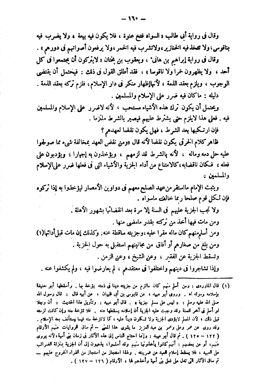 وقال في رواية أبي طالب " السواد فتح عنوة، فلا يكون فيه بيعة، ولا يضرب فيه بنا قوس ولا تتخذ فيه الخنازير، ولا تشرب في الخمر، ولا يرفعون أصواتهم في دورهم". وقال في رواية إبراهيم بن هانئ، ويعقوب بن بختان " لا يتركون أن يجتمعوا في كل أحد، ولا يظهرون خمرا ولا ناقوسا". فقد أطلق القول في ذلك. فيحتمل أن يقتضي الوجوب، ويلزم بعقد الذمة، لأنها إظهار منكر في دار الإسلام، فلزم تركه بعقد الذمة. دليله: ما كان فيه ضرر على الإسلام والمسلمين. ويحتمل أن يكون ترك هذه الأشياء مستحب، لأنه لا ضرر على الإسلام والمسلمين فيه. فعلى هذا لا يلزم حتى يشترط عليهم فيصير بالشرط ملتزما. فإن ارتكبها بعد الشرط، فهل يكون نقضا لعهدهم؟. ظاهر كلام الخرقي يكون نقضا لأنه قال " ومن نقض العهد بمخالفة شيء مما صولحوا عليه حل دمه وماله، لأنه بالشرط قد لزمهم، ويؤخذون به إجبارا، ويؤدبون على فعله" فكان ناقضا به، كالامتناع من أداء الجزية والأشياء التي في فعلها ضرر على الإسلام والمسلمين. ويثبت الإمام ما استقر من عهد الصُّلْحِ مَعَهُمْ فِي دَوَاوِينَ الْأَمْصَارِ لِيُؤْخَذُوا بِهِ إذَا تَرَكُوهُ فَإِنَّ لِكُلِّ قَوْمٍ صُلْحًا رُبَّمَا خَالَفَ مَا سِوَاهُ.