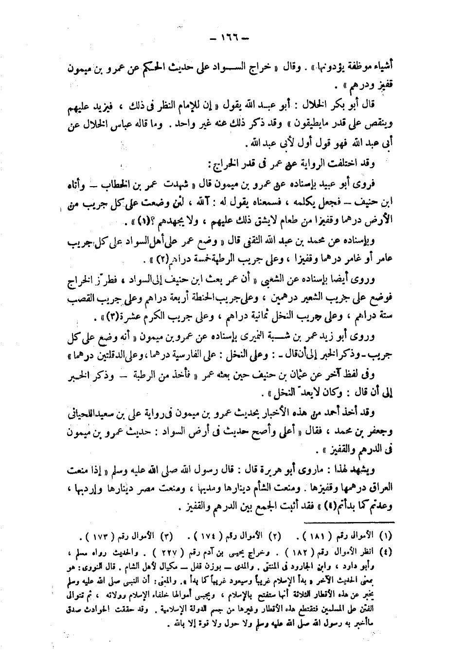 أشياء موظفة يؤدونها". وقال " خراج السواد على حديث الحكم عن عمرو بن ميمون قفيز ودرهم". قال أبو بكر الخلال: أبو عبد الله يقول " إن للإمام النظر في ذلك، فيزيد عليهم وينقص على قدر ما يطيقون". وقد ذكر ذلك عنه غير واحد، وما قاله عباس الخلال عن أبي بكر فهو قول أول لأبي عبد الله. وقد اختلفت الرواية عن عمر في قدر الخراج: فروي أبو عبيد بإسناده عن عمرو بن ميمون قال " شهدت عمر بن الخطاب - وأتاه ابن حنيف - فجعل يكلمه، فسمعناه يقول له: آلله، لئن وضعت على كل جريب من الأرض درهما وقفيزا من طعام لا يشق ذلك عليهم، ولا يجهدهم؟ ". وبإسناده عن محمد بن عبد الله اليقفي قال " وضع عمر على أهل السواد على كل جريب عامر أو غامر درهما وقفيزا، وعلى جريب الرطبة خمسة دراهم".