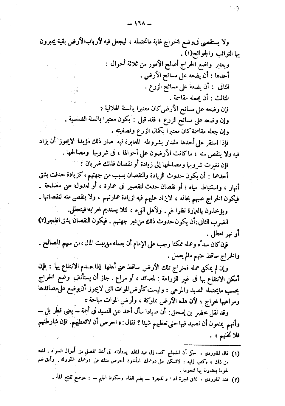 وَلَا يَسْتَقْصِي فِي وَضْعِ الْخَرَاجِ غَايَةَ مَا تحتمله، ليجعل فِيهِ لِأَرْبَابِ الْأَرْضِ بَقِيَّةً يُجْبِرُونَ بِهَا النَّوَائِبَ والجوائح. ويعتبر واضع الخراج أصلح الأمور من ثلاثة أحوال: أحدها: أن يضعه على مسائح الأرض. الثاني: أن يضعه على مسائح الزرع. الثالث: أن يجعله مُقَاسَمَةً. فَإِنْ وَضَعَهُ عَلَى مَسَائِحِ الْأَرْضِ كَانَ مُعْتَبَرًا بِالسَّنَةِ الْهِلَالِيَّةِ. وَإِنْ وَضَعَهُ عَلَى مَسَائِحِ الزرع، فقد قيل: يكون مُعْتَبَرًا بِالسَّنَةِ الشَّمْسِيَّةِ. وَإِنْ جَعَلَهُ مُقَاسَمَةً كَانَ مُعْتَبَرًا بِكَمَالِ الزَّرْعِ وَتَصْفِيَتِهِ. فَإِذَا اسْتَقَرَّ عَلَى أحدها مقدار بشروطه الْمُعْتَبَرَةِ فِيهِ صَارَ ذَلِكَ مُؤَبَّدًا لَا يَجُوزُ أَنْ يُزَادَ فِيهِ وَلَا يُنْقَصَ مِنْهُ، مَا كانت الأرضون على أحوالها، في شروبها ومصالحها. فإن تغيرت شروبها ومصالحها إلى زيادة أو نقصان فَذَلِكَ ضَرْبَانِ: أَحَدُهُمَا: أَنْ يَكُونَ حُدُوثُ الزِّيَادَةِ وَالنُّقْصَانِ بِسَبَبٍ مِنْ جِهَتِهِمْ، كَزِيَادَةٍ حَدَثَتْ بِشَقِّ أنهار، واستنباط مياه، أو نقصان حدث لتقصير في عمارة، أو لعدول عن مصلحة. فَيَكُونُ الْخَرَاجُ عَلَيْهِمْ بِحَالِهِ، لَا يُزَادُ عَلَيْهِمْ فيه لزيادة عمارتهم، ولا ينقص منه لنقصانها.