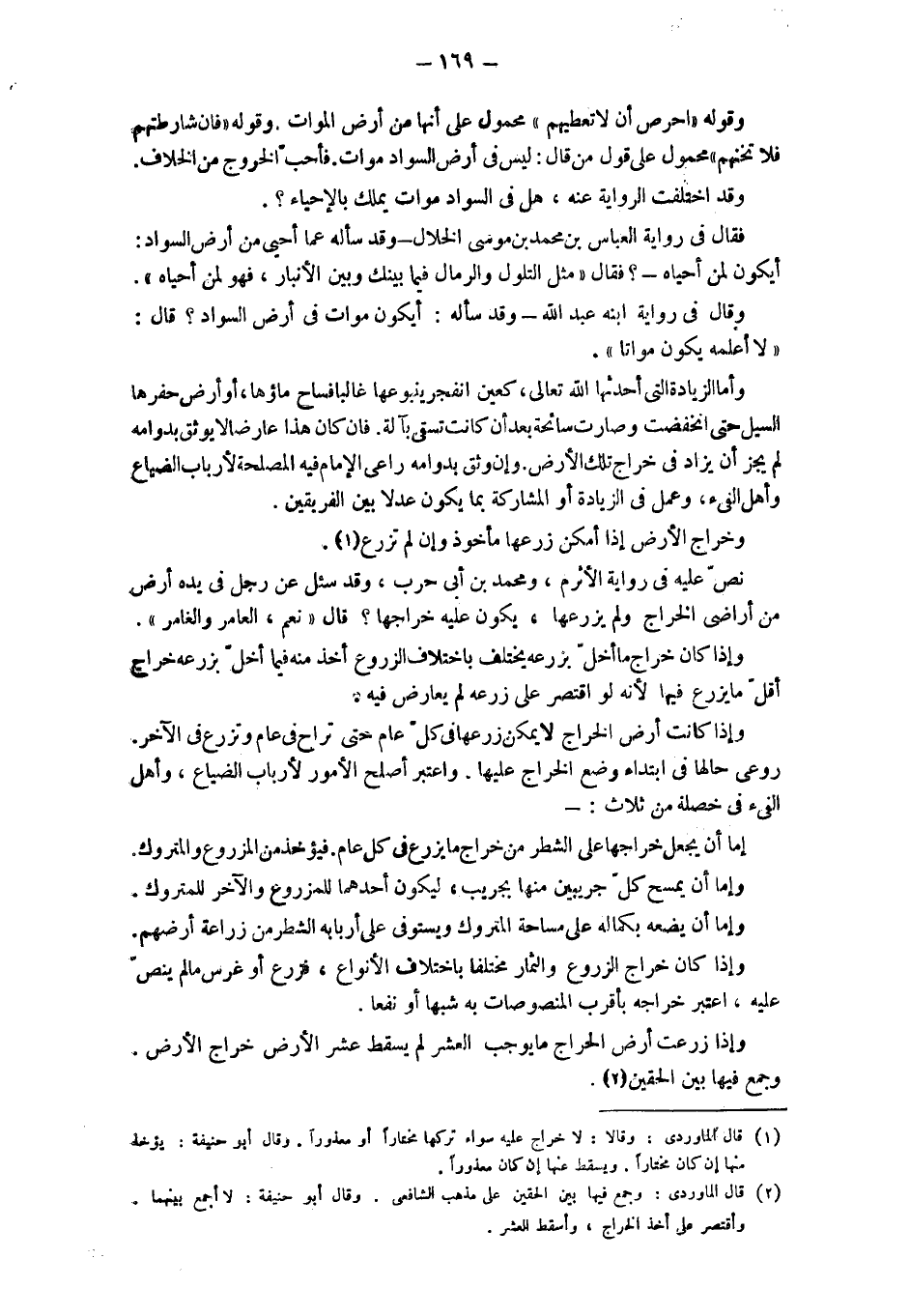 وقوله " احرص أن لا تعطيهم " محمول على أنها من أرض الموات، وقوله " فإن شارطتهم فلا تخنهم" محمول على قول من قال: ليس في أرض السواد موات. فأحب الخروج من الخلاف. وقد اختلفت الرواية عنه، هل في السواد موات يملك بالأحياء؟. فقال في رواية العباس بن محمد بن موسى الخلال - وقد سأله عما أحيى من أرض السواد: أيكون لمن أحياه-؟ فقال: " مثل التلول والرمال فيما بينك وبين الأنبار، فهو لمن أحياه". وقال في رواية ابنه عبد الله - وقد سأله: أيكون موات في أرض السواد؟ قال: " لا أعلمه يكون مواتا". وأما الزيادة التي أحدثها الله تعالى، كعين انفجر ينبوعها غالبا فساح ماؤها، أو أرض حفرها السيل حتى انخفضت وصارت سَائِحَةً بَعْدَ أَنْ كَانَتْ تُسْقَى بِآلَةٍ، فَإِنْ كان هذا عارضا ضالا يُوثَقُ بِدَوَامِهِ لَمْ يَجُزْ أَنْ يُزَادَ فِي خراج تلك الأرض، وَإِنْ وُثِقَ بِدَوَامِهِ رَاعَى الْإِمَامُ فِيهِ الْمَصْلَحَةَ لِأَرْبَابِ الضِّيَاعِ وَأَهْلِ الْفَيْءِ، وَعَمِلَ فِي الزِّيَادَةِ أو المشاركة بِمَا يَكُونُ عَدْلًا بَيْنَ الْفَرِيقَيْنِ. وَخَرَاجُ الْأَرْضِ إذا أمكن زرعها مأخوذ وإن لم تزرع.
