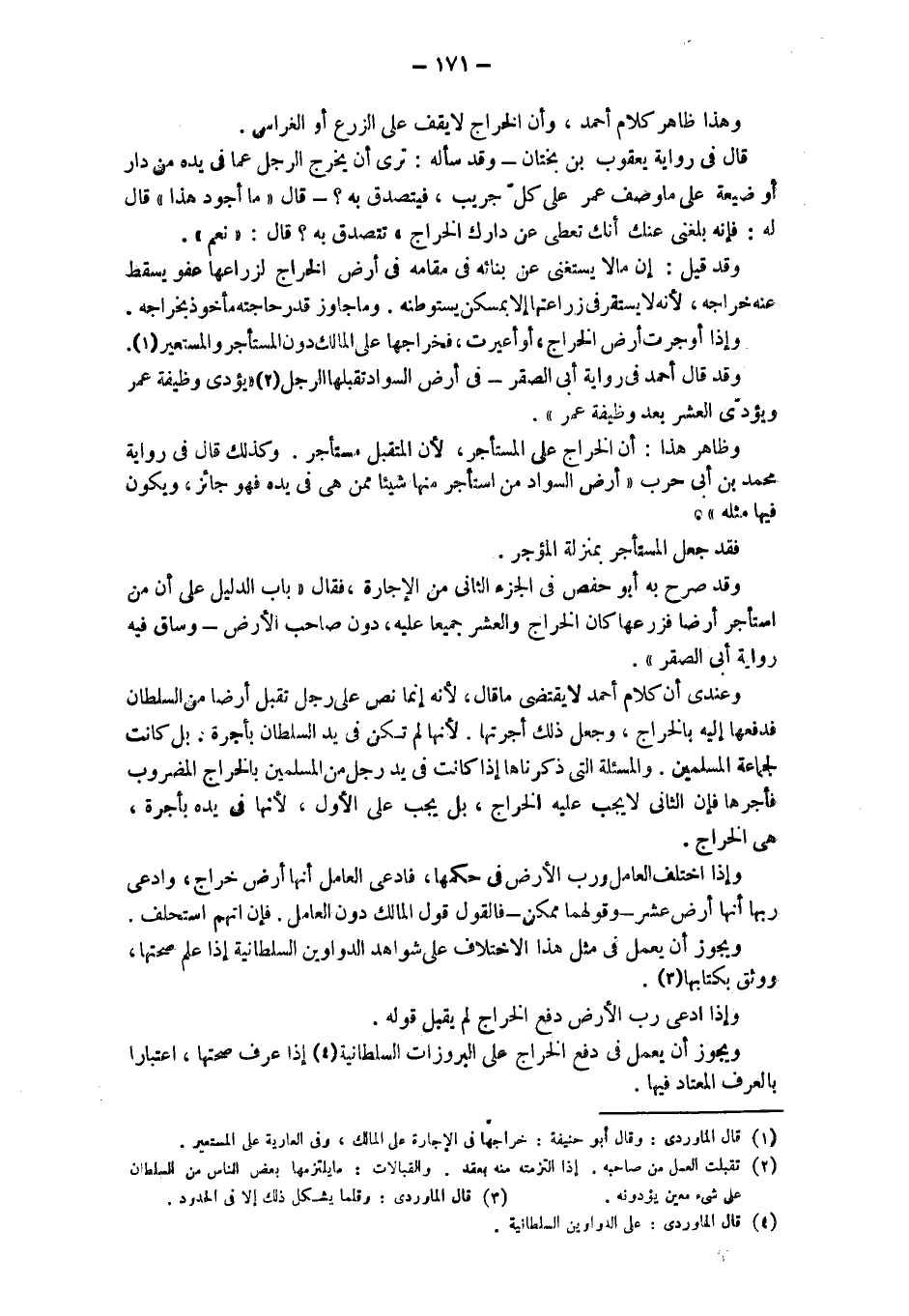 وهذا ظاهر كلام أحمد، وأن الخراج لا يقف على الزرع أو الغراس. قال في رواية يعقوب بن بختان - وقد سأله: ترى أن يخرج الرجل عما في يده من دار أو ضيعة على ما وصف عمر على كل جريب فيتصدق به؟ - قال: " ما أجود هذا " قال له: فإنه بلغني عنك أنك تعطي عن دارك الخراج، تتصدق به؟ قال: " نعم". وقد قيل: إن مالا يستغني في زراعتها عن بنائه في مقامه في أرض الخراج لزراعها عفو يسقط عنه خراجه، لأنه لا يسقر في زراعتها إلا بمسكن يستوطنه، وما جاز قدر حاجته مَأْخُوذٌ بِخَرَاجِهِ. وَإِذَا أُوجِرَتْ أَرْضُ الْخَرَاجِ، أَوْ أُعِيرَتْ، فَخَرَاجُهَا عَلَى الْمَالِكِ دُونَ الْمُسْتَأْجِرِ وَالْمُسْتَعِيرِ. وقد قال أحمد في رواية أبي الصقر - في أرض السواد تقبلها الرجل " يؤدي وظيفة عرم ويؤدي العشر بعد وظيفة عمر". وظاهر هذا: أن الخراج على المستأجر، لأن المتقبل مستأجر. وكذلك قال في رواية محمد بن أبي حرب " أرض السواد من استأجر منها شيئا ممن هي في يده فهو جائز، ويكون فيها مثله".