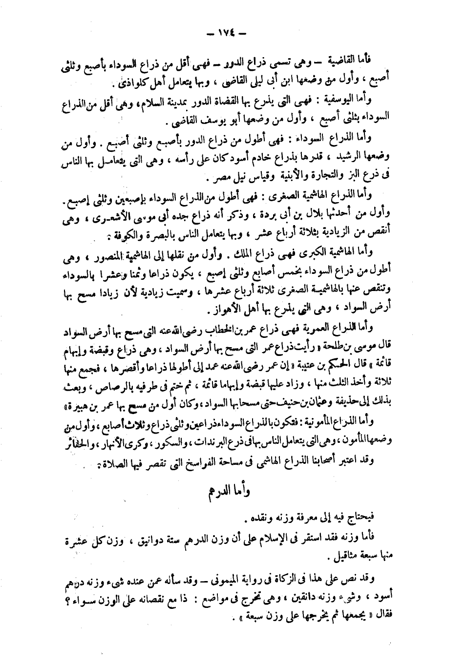وأما اليوسفية: فهي التي يذرع بها القضاة الدور بمدينة السلام، وهي أَقَلُّ مِنْ الذِّرَاعِ السَّوْدَاءِ بِثُلُثَيْ أُصْبُعٍ، وَأَوَّلُ مَنْ وَضَعَهَا أَبُو يُوسُفَ الْقَاضِي. وَأَمَّا الذِّرَاعُ السَّوْدَاءُ: فَهِيَ أَطْوَلُ مِنْ ذِرَاعِ الدُّورِ بِأُصْبُعٍ وثلثي أصبع، وأول من وضعها الرشيد، قَدَّرَهَا بِذِرَاعِ خَادِمٍ أَسْوَدَ كَانَ عَلَى رَأْسِهِ، وهي التي يتعامل بها الناس في ذرع الْبَزِّ وَالتِّجَارَةِ وَالْأَبْنِيَةِ وَقِيَاسِ نِيلِ مِصْرَ. وَأَمَّا الذراع الهاشمية الصغرى: فَهِيَ أَطْوَلُ مِنْ الذِّرَاعِ السَّوْدَاءِ بِأُصْبُعَيْنِ وَثُلُثَيْ أُصْبُعٍ. وَأَوَّلُ مَنْ أَحْدَثَهَا بِلَالُ بْنُ أَبِي بردة، وذكر أنه ذراع جده موسى الأشعري، وَهِيَ أَنْقَصُ مِنْ الزِّيَادِيَّةِ بِثَلَاثَةِ أَرْبَاعِ عُشْرٍ، وَبِهَا يَتَعَامَلُ النَّاسُ بِالْبَصْرَةِ وَالْكُوفَةِ. وَأَمَّا الْهَاشِمِيَّةُ الكبرى فهي ذِرَاعُ الْمِلْكِ، وَأَوَّلُ مَنْ نَقَلَهَا إلَى الْهَاشِمِيَّةِ المنصور، وهي أطول من ذراع السوداء بخمس أصابع وثلثي إصبع، يكون ذراعا وثمنا وعشرا بالسوداء وتنقص عنها بالهاشمية الصغرى ثلاثة أرباع عشرها، وسميت زيادية لأن زيادا مسح بها أرص السَّوَادِ، وَهِيَ الَّتِي يَذْرُعُ بِهَا أَهْلُ الْأَهْوَازِ. وَأَمَّا الذِّرَاعُ الْعُمَرِيَّةُ فَهِيَ ذِرَاعُ عُمَرَ بْنِ الْخَطَّابِ - رَضِيَ اللَّهُ عَنْهُ - الَّتِي مَسَحَ بِهَا أرض السواد قال موسى بن طلحة: رأيت ذراع عمر الَّتِي مَسَحَ بِهَا أَرْضَ السَّوَادِ، وَهِيَ ذِرَاعٌ وقبضة وإبهام قائمة". قال الحكم بن عتيبة " إنَّ عُمَرَ - رَضِيَ اللَّهُ عَنْهُ - عَمَدَ إلَى أطولها ذراعا وأقصرها، فَجَمَعَ مِنْهَا ثَلَاثَةً وَأَخَذَ الثُّلُثَ مِنْهَا، وَزَادَ عليها قَبْضَةً وَإِبْهَامًا قَائِمَةً، ثُمَّ خَتَمَ فِي طَرَفَيْهِ بِالرَّصَاصِ، وَبَعَثَ بِذَلِكَ إلَى حُذَيْفَةَ وَعُثْمَانَ بْنِ حُنَيْفٍ حَتَّى مَسَحَا بِهَا السَّوَادَ، وَكَانَ أَوَّلَ من مسح بها عمر بن هبيرة". وأما الذراع المأمونية: فتكون بالذراع السوداء ذراعين وثلثي ذراع وثلاث أصابع، وأول من وضعها المأمون، وهي التي يتعامل الناس بها في ذرع البرندات، والسكور، وكري الأنهار، والحفائر وقد اعتبر أصحابنا الذراع الهاشمي في مساحة الفراسخ التي تقصر فيها الصلاة. وَأَمَّا الدِّرْهَمُ فَيَحْتَاجُ فِيهِ إلَى مَعْرِفَةِ وَزْنِهِ ونقده.
