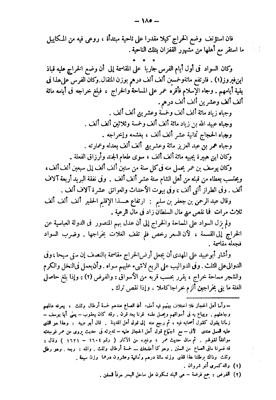 فَإِنْ اُسْتُؤْنِفَ وَضْعُ الْخَرَاجِ كَيْلًا مُقَدَّرًا عَلَى نَاحِيَةٍ مُبْتَدَأَةٍ، رُوعِيَ فِيهِ مِنْ الْمَكَايِيلِ مَا اسْتَقَرَّ مَعَ أَهْلِهَا مِنْ مَشْهُورِ الْقُفْزَانِ بِتِلْكَ الناحية. وَكَانَ السَّوَادُ فِي أَوَّلِ أَيَّامِ الْفُرْسِ جَارِيًا على المقاسمة إلى أن وضع الخراج عليه قباذ ابن فيروز. فارتفع مائة وخمسين ألف ألف درهم بوزن المثقال. وكان الْفُرْسُ عَلَى هَذَا فِي بَقِيَّةِ أَيَّامِهِمْ. وَجَاءَ الإسلام فأقره عمر على المساحة والخراج، فبلغ خراجه في أيام مِائَةَ أَلْفِ أَلْفٍ وَعِشْرِينَ أَلْفَ أَلْفِ دِرْهَمٍ. وجباه زياد مائة ألف ألف وخمسة وعشرين ألف ألف. وَجَبَاهُ عُبَيْدُ اللَّهِ بْنُ زِيَادٍ مِائَةَ أَلْفِ ألف وخمسة وثلاثين ألف ألف. وجباه الحجاج ثمانية عشر ألف ألف، بغشمة وإخراجه.