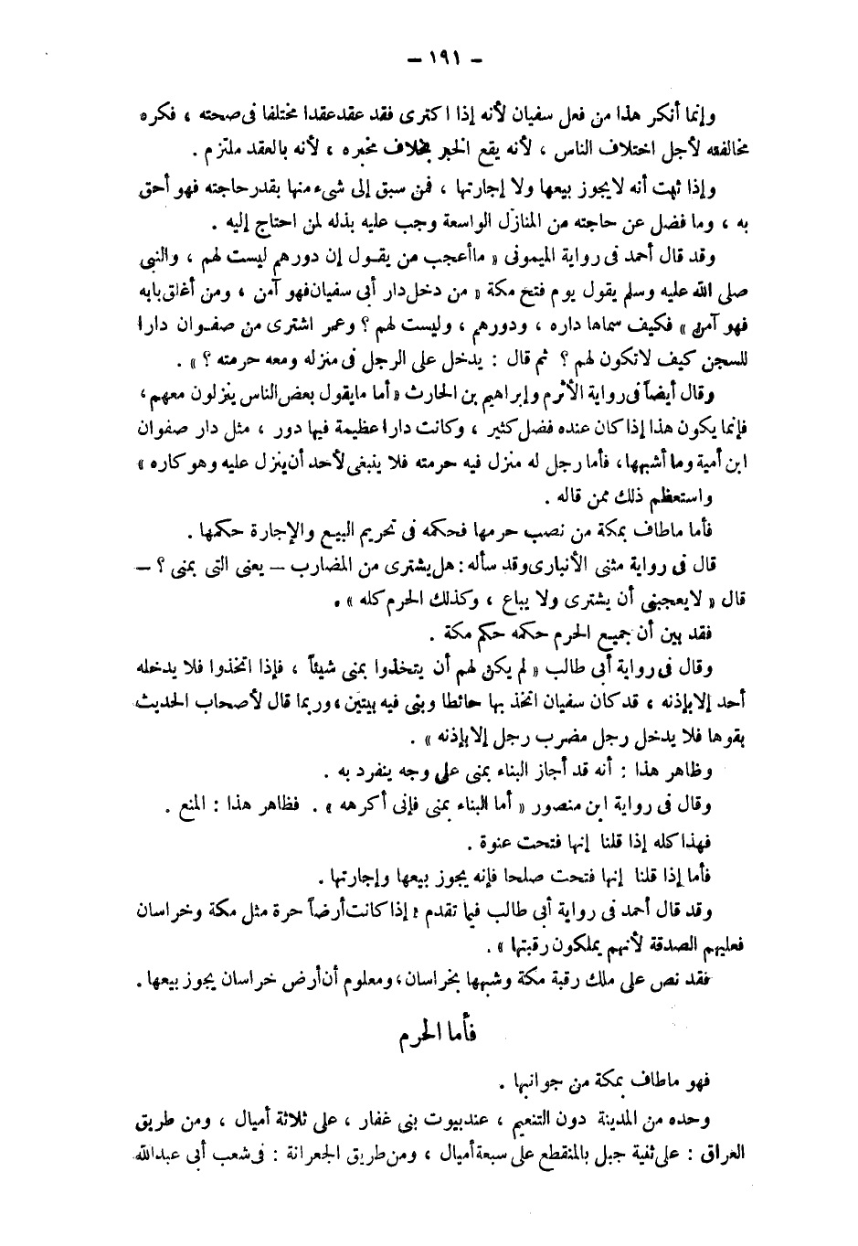 وقال في رواية أبي طالب " لم يكن لهم أن يتخذوا بمنى شيئا، فإذا اتخذوا فلا يدخله أحد إلا بإذنه، قد كان سفيان اتخذ بها حائطا وبنى فيه بيتين، وربما قال لأصحاب الحديث بقوها فلا يدخل رجل مضرب رجل إلا بإذنه". وظاهر هذا: أنه قد أجاز البناء بمنى على وجه ينفرد به. وقال في رواية ابن منصور " أما البناء بمنى فإني أكرهه". فظاهر هذا: المنع. فهذا كله إذا قلنا إنها فتحت عنوة. فأما إذا قلنا إنها فتحت عنوة صلحا فإنه يجوز بيعها وإجارتها. وقد قال أحمد في رواية أبي طالب فيما تقدم " إذا كان أرضا حرة مثل مكة وخراسان فعليهم الصدقة لأنهم يملكون رقبتها". فقد نص على ملك رقبة مكة وشبهها بخراسان، ومعلوم أن أرض خراسان يجوز بيعها. فأما الحرم فهو ما طاف بمكة من جوانبها. وحده من المدينة دون التنعيم، عند بيوت بني غفار، عَلَى ثَلَاثَةِ أَمْيَالٍ، وَمِنْ طَرِيقِ الْعِرَاقِ، عَلَى ثَنِيَّةِ جَبَلٍ بِالْمُنْقَطِعِ عَلَى سَبْعَةِ أَمْيَالٍ، وَمِنْ طريق الجعرانة: في شعب أبي عبد الله