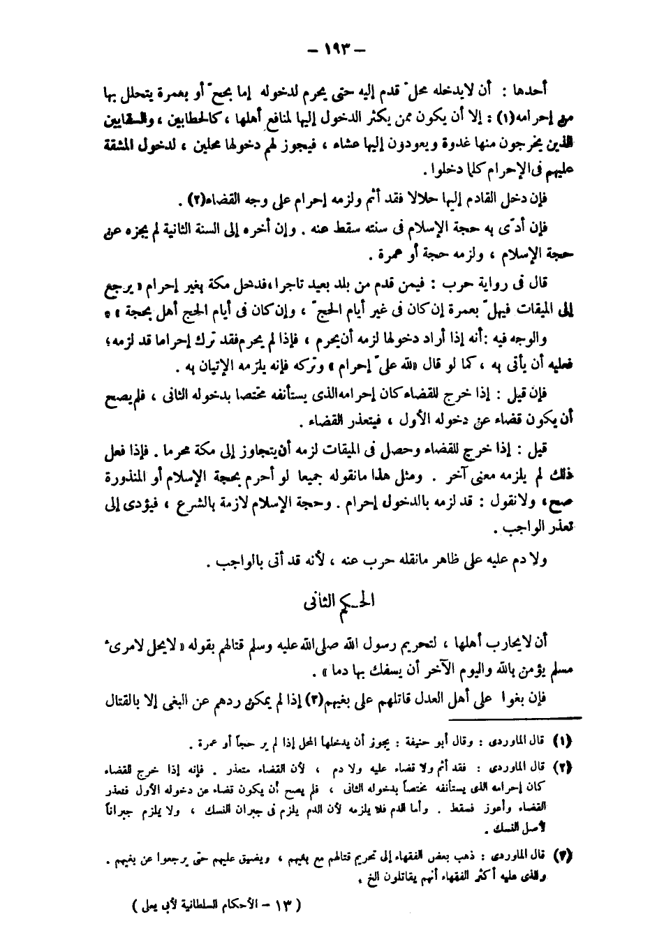 قال في رواية حرب: فيمن قدم من بلد بعيد تاجرا فدخل مكة بغير إحرام " يرجع إلى الميقات فيهل بعمرة إن كان في غير أيام الحج، وإن كان في أيام الحج أهل بحجة". والوجه فيه: أنه إذا أراد دخولها لزمه أن يحرم، فإذا لم يحرم فقد ترك إحراما قد لزمه، فعليه أن يأتي به، كما لو قال " لله عليّ إحرام" وتركه يلزمه الإتيان به. فإن قيل: إذَا خَرَجَ لِلْقَضَاءِ كَانَ إحْرَامُهُ الَّذِي يَسْتَأْنِفُهُ مُخْتَصًّا بِدُخُولِهِ الثَّانِي، فَلَمْ يَصِحَّ أَنْ يَكُونَ قضاء عن دخوله الأول، فيتعذر القضاء. قيل: إذا خرج للقضاء وحصل في الميقات لزمه أن يتجاوز إلى مكة محرما، فإذا فعل ذلك لم يلزمه معنى آخر. ومثل هذا ما نقوله جميعا لو أحرم بحجة الإسلام أو المنذورة صح، ولا نقول: قد لزمه بالدخول إحرام، وحجة الإسلام لازمة بالشرع، فيؤدي إلى تعذر الواجب. ولا دم عليه على ظاهر ما نقله جرب عنه، لأنه قد أتى بالواجب. الحكم الثَّانِي أَنْ لَا يُحَارَبَ أَهْلُهَا، لِتَحْرِيمِ رَسُولِ الله - صلى الله عليه وسلم - قتالهم " لا يحل لامرئ مسلم يُؤْمِنُ بِاَللَّهِ وَالْيَوْمِ الْآخِرِ أَنْ يَسْفِكَ بِهَا دما". فإن بغوا على أهل العدل قاتلهم عَلَى بَغْيِهِمْ إذَا لَمْ يُمْكِنْ رَدُّهُمْ عَنْ البغي إلا بالقتال