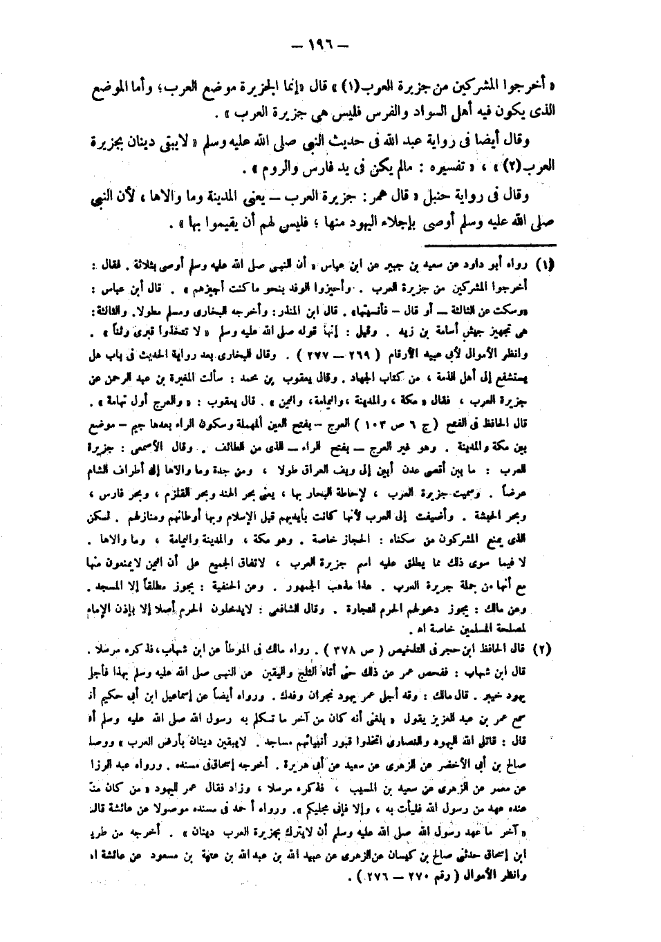 " أخرجوا المشركين من بلاد العرب" قال: " إنما الجزيرة موضع العرب، وأما الموضع الذي يكون فيه أهل السواد والفرس فليس هي جزيرة العرب". وقال أيضا في رواية عبد الله في حديث النبي - صلى الله عليه وسلم - " لا يبقى دينان بجزيرة العرب " وتفسيره: ما لم يكن في يد فارس والروم". وقال في رواية حنبل" قال: عمر: جزيرة العرب - يعني المدينة وما والاها، لأن النبي - صلى الله عليه وسلم - أوصى بإجلاء اليهود منها، فليس لهم أن يقيموا بها".