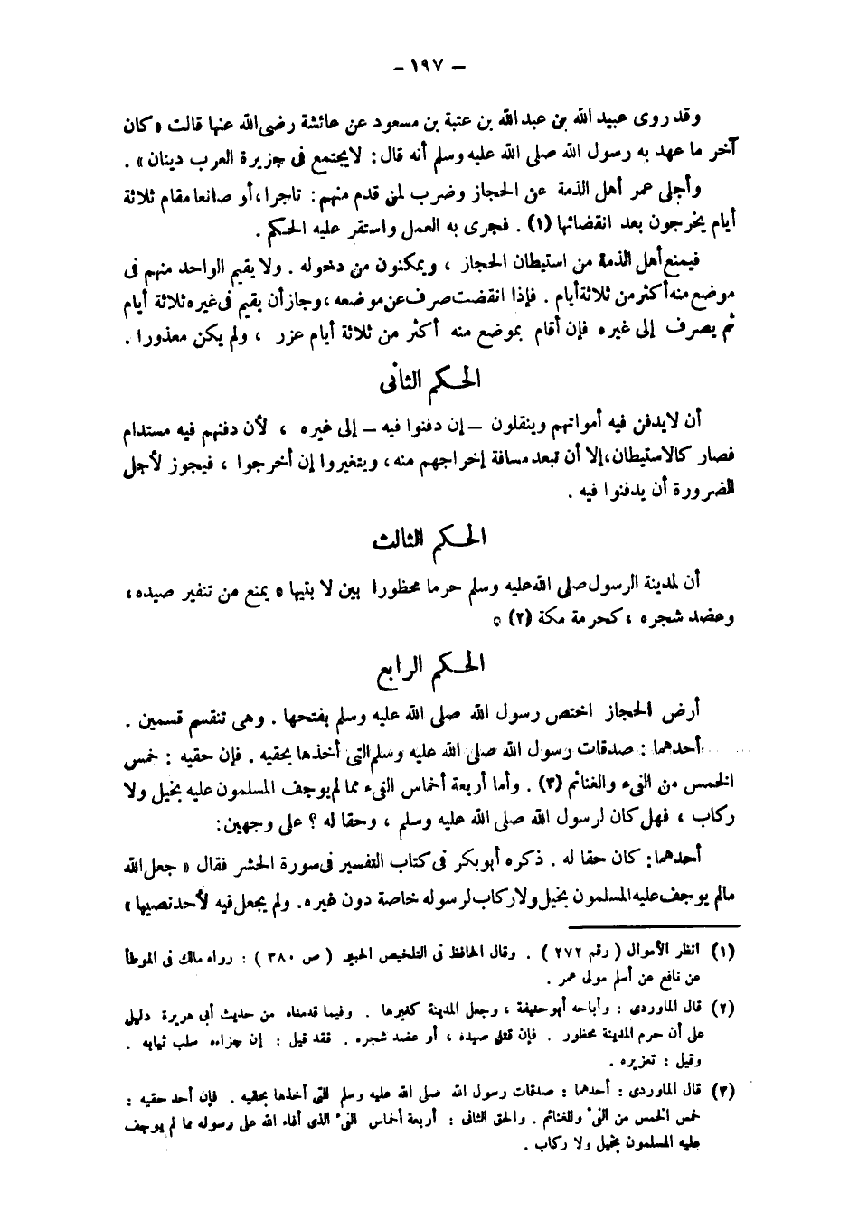 وَقَدْ رَوَى عُبَيْدُ اللَّهِ بْنُ عَبْدِ اللَّهِ بن عتبة بن مسعود عن عائشة رضي الله عنها قَالَتْ " كَانَ آخِرُ مَا عَهِدَ بِهِ رَسُولُ اللَّهِ - صَلَّى اللَّهُ عَلَيْهِ وَسَلَّمَ - أَنَّهُ قَالَ: لَا يَجْتَمِعُ فِي جَزِيرَةِ الْعَرَبِ دِينَانِ". وَأَجْلَى عمر أَهْلَ الذِّمَّةِ عَنْ الْحِجَازِ وَضَرَبَ لِمَنْ قَدِمَ منهم: تاجرا، أوصانعا مقام ثلاثة أيام يخرجون بَعْدَ انْقِضَائِهَا. فَجَرَى بِهِ الْعَمَلُ وَاسْتَقَرَّ عَلَيْهِ الحكم. فيمنع أهل الذمة من استيطان الحجاز، ويمكنون مِنْ دُخُولِهِ، وَلَا يُقِيمُ الْوَاحِدُ مِنْهُمْ فِي مَوْضِعٍ مِنْهُ أَكْثَرَ مِنْ ثَلَاثَةِ أَيَّامٍ، فَإِذَا انْقَضَتْ صُرِفَ عَنْ مَوْضِعِهِ، وَجَازَ أَنْ يُقِيمَ فِي غَيْرِهِ ثَلَاثَةَ أَيَّامٍ ثُمَّ يُصْرَفَ إلَى غَيْرِهِ فَإِنْ أَقَامَ بِمَوْضِعٍ مِنْهُ أَكْثَرَ مِنْ ثلاثة أيام عزر، ولم يكن معذورا. الحكم الثاني أن لا يدفن فيه أمواتهم وينقلون - إنْ دُفِنُوا فِيهِ - إلَى غَيْرِهِ، لِأَنَّ دَفْنَهُمْ فيه مستدام فصار كالاستيطان إلا أن تبعد مَسَافَةُ إخْرَاجِهِمْ مِنْهُ، وَيَتَغَيَّرُوا إنْ أُخْرِجُوا، فَيَجُوزُ لأجل الضرورة أن يدفنوا فيه. الحكم الثالث أن لمدينة الرسول - صلى الله عليه وسلم - حرما محظورا بَيْنَ لَابَتَيْهَا، يُمْنَعُ مِنْ تَنْفِيرِ صَيْدِهِ، وَعَضُدِ شجره، كحرمة مكة. الحكم الرابع أرض الحجاز اختص رَسُولِ اللَّهِ - صَلَّى اللَّهُ عَلَيْهِ وَسَلَّمَ - بِفَتْحِهَا، وهي تنقسم قسمين. أحدها: صدقات رسول الله - صلى الله عليه وسلم - التي أخذها بحقيه. فإن حقيه: خمس الخمس من الفيء والغنائم.