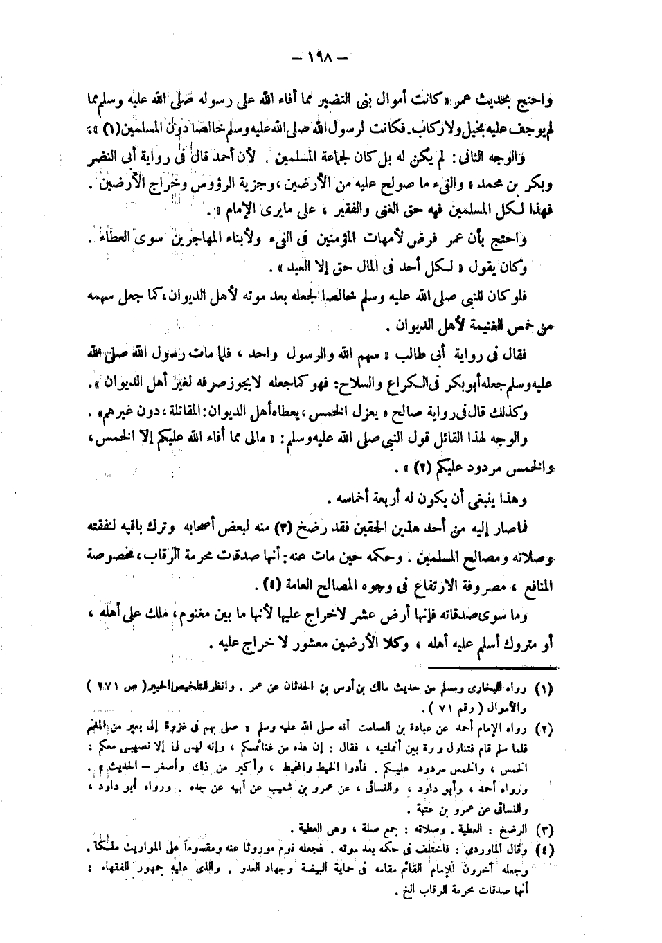 واحتج بحديث عمر " كانت أموال بني النضير مما أفاء الله على رسوله - صلى الله عليه وسلم - مما لم يوجف عليه بخيل ولا ركاب، فكانت لرسول الله - صلى الله عليه وسلم - خالصا دون المسلمين". والوجه الثاني: لم يكن له بل كان لجماعة المسلمين، لأن أحمد قال في رواية أبي النضر وبكر بن محمد " والفيء ما صولح عليه من الأرضين، وجزية الرؤوس وخراج الأرضين. فهذا لكل المسلمين فيه حق الغني والفقير على ما يرى الإمام". واحتج بأن عمر فرض لأمهات المؤمنين في الفيء ولأبناء المهاجرين سوى العطاء. وكان يقول " لكل أحد في المال حق إلا العبد". فلو كان النبي - صلى الله عليه وسلم - خالصا لجعله بعد موته لأهل الديوان، كما جعل سهمه من خمس الغنيمة لأهل الديوان. فقال في رواية أبي طالب " سهم الله والرسول واحد، فلما مات رسول الله - صلى الله عليه وسلم - جعله أبو بكر في الكراع والسلاح، فهو كما جعله لا يجوز صرف لغير أهل الديوان". وكذلك قال في رواية صالح " يعزل الخمس، يعطاه أهل الديوان: المقاتلة دون غيرهم ". والوجه لهذا القائل قول النبي - صلى الله عليه وسلم -: " ما لي مما أفاء الله عليكم إلا الخمس، والخمس مردود عليكم". وهذا ينبغي أن يكون له أربعة أخماسه. فما صار إليه من أحد هَذَيْنِ الْحَقَّيْنِ فَقَدْ رَضَخَ مِنْهُ لِبَعْضِ أَصْحَابِهِ وترك باقيه لنفقته وصلاته ومصالح المسلمين، وحكمه حين مات عنه: أَنَّهَا صَدَقَاتٌ مُحَرَّمَةُ الرِّقَابِ مَخْصُوصَةُ الْمَنَافِعِ، مَصْرُوفَةٌ الارتفاع فِي وُجُوهِ الْمَصَالِحِ الْعَامَّةِ.