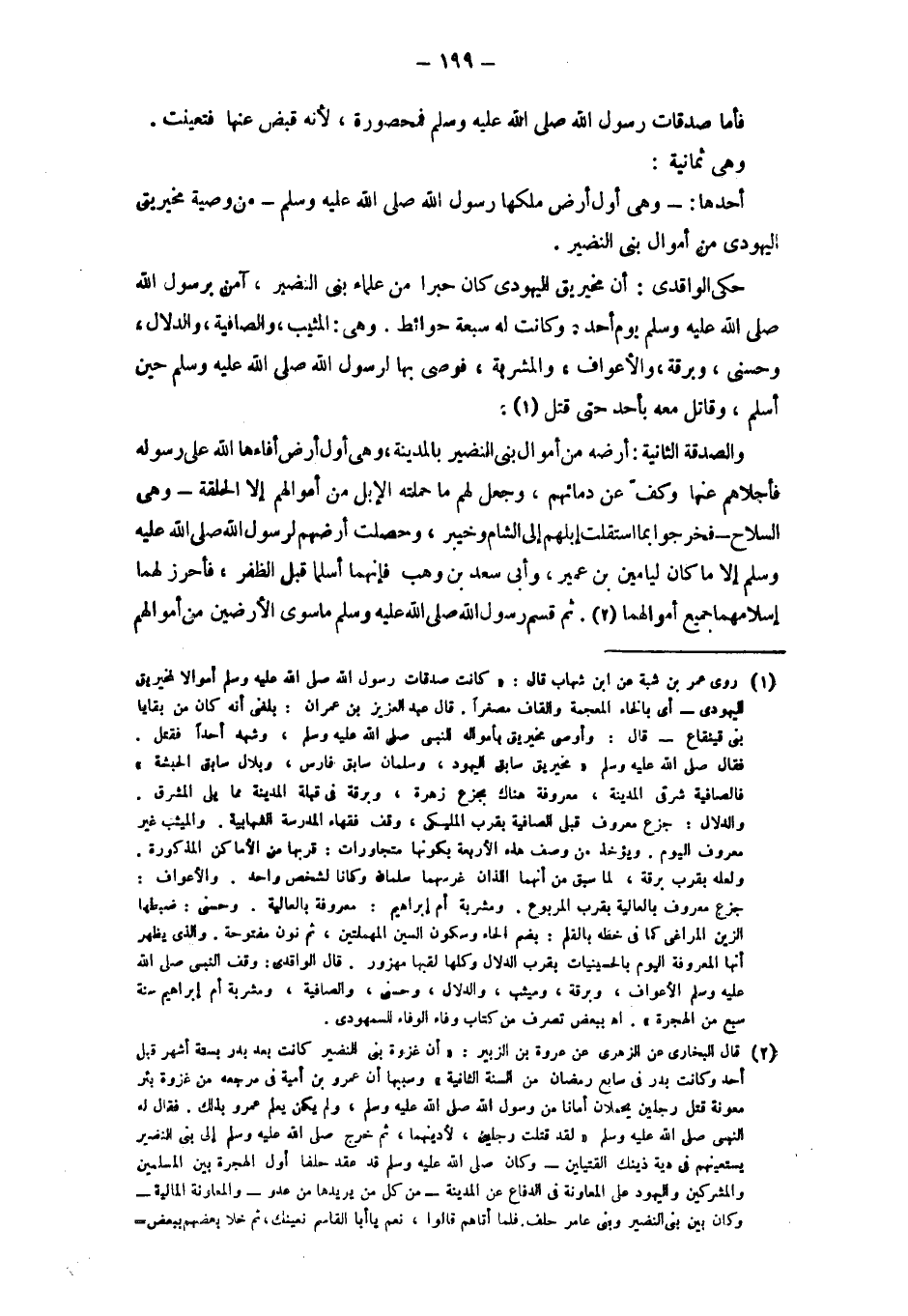 فأما الصدقات رسول الله - صلى الله عليه وسلم - فمحصورة، لأنه قيض عنها فتعينت. هي ثمانية: أحدها: - وَهِيَ أَوَّلُ أَرْضٍ مَلَكَهَا رَسُولُ اللَّهِ - صَلَّى الله عليه وسلم - من وَصِيَّةُ مُخَيْرِيقٍ الْيَهُودِيِّ مِنْ أَمْوَالِ بَنِي النَّضِيرِ. حكى الواقدي: أن مخيريق الْيَهُودِيَّ كَانَ حَبْرًا، مِنْ عُلَمَاءِ بَنِي النَّضِيرِ، آمَنَ بِرَسُولِ اللَّهِ - صَلَّى اللَّهُ عَلَيْهِ وَسَلَّمَ - يَوْمَ أُحُدٍ. وَكَانَتْ لَهُ سَبْعَةُ حَوَائِطَ. وَهِيَ: المثبت، والصافية، والدلال وحسنى، وبرقة، والأعواف، والمشربة، فَوَصَّى بِهَا لِرَسُولِ اللَّهِ - صَلَّى اللَّهُ عَلَيْهِ وَسَلَّمَ - حِينَ أَسْلَمَ، وَقَاتَلَ مَعَهُ بِأُحُدٍ حَتَّى قتل. وَالصَّدَقَةُ الثَّانِيَةُ: أَرْضُهُ مِنْ أَمْوَالِ بَنِي النَّضِيرِ بِالْمَدِينَةِ، وَهِيَ أَوَّلُ أَرْضٍ أَفَاءَهَا اللَّهُ عَلَى رَسُولِهِ فَأَجْلَاهُمْ عَنْهَا وَكَفَّ عَنْ دِمَائِهِمْ، وَجَعَلَ لَهُمْ مَا حَمَلَتْهُ الْإِبِلُ مِنْ أَمْوَالِهِمْ إلَّا الْحَلَقَةَ - وَهِيَ السِّلَاحُ - فَخَرَجُوا بِمَا اسْتَقَلَّتْ إبِلُهُمْ إلى الشام وخيبر، وحصلت أرضهم لِرَسُولِ اللَّهِ - صَلَّى اللَّهُ عَلَيْهِ وَسَلَّمَ - إلَّا ما كان ليامين بْنِ عُمَيْرٍ، وَأَبِي سَعْدِ بْنِ وَهْبٍ فَإِنَّهُمَا أسلما قبل المظفر، فَأَحْرَزَ لَهُمَا إسْلَامُهُمَا جَمِيعَ أَمْوَالِهِمَا، ثُمَّ قَسَّمَ رَسُولُ اللَّهِ - صَلَّى اللَّهُ عَلَيْهِ وَسَلَّمَ - مَا سِوَى الْأَرْضَيْنِ مِنْ أَمْوَالِهِمْ.