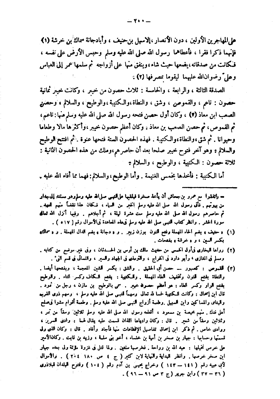عَلَى الْمُهَاجِرِينَ الْأَوَّلِينَ، دُونَ الْأَنْصَارِ، إلَّا سَهْلَ بْنَ حُنَيْفٍ، وَأَبَا دُجَانَةَ سِمَاكَ بْنَ خَرَشَةَ، فإنهما ذكرا فقرا، فأعطاهما رسول الله - صلى الله عليه وسلم - وحبس الأرض عَلَى نَفْسِهِ، فَكَانَتْ مِنْ صَدَقَاتِهِ، يَضَعُهَا حَيْثُ شاء، وَيُنْفِقُ مِنْهَا عَلَى أَزْوَاجِهِ ثُمَّ سَلَّمَهَا عُمَرُ إلَى الْعَبَّاسِ وَعَلِيٍّ رِضْوَانُ اللَّهِ عَلَيْهِمَا لِيَقُومَا بمصرفها. الصدقة الثالثة، والرابعة، والخامسة: ثلاث حصون من خيبر، وكانت خيبر ثَمَانِيَةَ حُصُونٍ: نَاعِمَ، وَالْقُمُوصَ، وَشَقَّ، وَالنَّطَاةَ، وَالْكَتِيبَةَ، والوطيح، والسلالم، وحصن الصعب ابن مُعَاذٍ، وَكَانَ أَوَّلَ حِصْنٍ فَتَحَهُ رَسُولُ اللَّهِ - صلى الله عليه وسلم - منها: ناعم، ثم القموص، ثُمَّ حِصْنَ الصَّعْبِ بْنِ مُعَاذٍ.