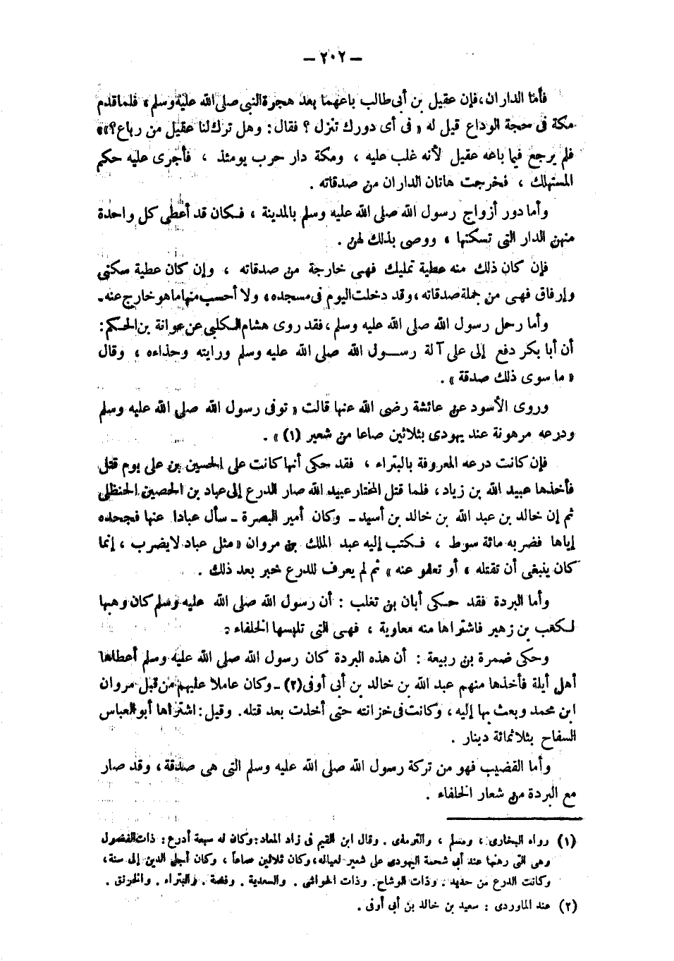 فَأَمَّا الدَّارَانِ، فَإِنَّ عَقِيلَ بْنَ أَبِي طَالِبٍ باعهما بد هجرة النبي - صَلَّى اللَّهُ عَلَيْهِ وَسَلَّمَ - فَلَمَّا قَدِمَ مَكَّةَ فِي حَجَّةِ الْوَدَاعِ قِيلَ لَهُ " فِي أَيِّ دورك تنزل؟ فقال: وهل ترك لنا عقيل من رباع؟ ". فلم يرجع فيما باعه عقيل لأنه غلب عَلَيْهِ، وَمَكَّةُ دَارُ حَرْبٍ يَوْمَئِذٍ، فَأَجْرَى عَلَيْهِ حُكْمَ الْمُسْتَهْلَكِ، فَخَرَجَتْ هَاتَانِ الدَّارَانِ مِنْ صَدَقَاتِهِ. وأما دور أَزْوَاجَ رَسُولِ اللَّهِ - صَلَّى اللَّهُ عَلَيْهِ وَسَلَّمَ - بالمدينة، فكان قد أعطى كل واحدة منهن الدار التي تسكنها، وَوَصَّى بِذَلِكَ لَهُنَّ. فَإِنْ كَانَ ذَلِكَ مِنْهُ عَطِيَّةَ تَمْلِيكٍ فَهِيَ خَارِجَةٌ مِنْ صَدَقَاتِهِ، وَإِنْ كَانَ عَطِيَّةَ سُكْنَى وَإِرْفَاقٍ فَهِيَ مِنْ جُمْلَةِ صدقاته، وقد دخلت اليوم في مسجده، وَلَا أَحْسَبُ مِنْهَا مَا هُوَ خَارِجٌ عَنْهُ. وَأَمَّا رَحْلُ رَسُولِ اللَّهِ - صَلَّى اللَّهُ عَلَيْهِ وسلم - فَقَدْ رَوَى هِشَامٌ الْكَلْبِيُّ عَنْ عَوَانَةَ بْنِ الحكم: أن أبا بكر دفع إلى علي آلَةَ رَسُولِ اللَّهِ - صَلَّى اللَّهُ عَلَيْهِ وَسَلَّمَ - ورايته وَحِذَاءَهُ، وَقَالَ " مَا سِوَى ذَلِكَ صَدَقَةٌ". وَرَوَى الْأَسْوَدُ عَنْ عَائِشَةَ رَضِيَ اللَّهُ عَنْهَا قَالَتْ " تُوُفِّيَ رَسُولُ اللَّهِ - صَلَّى اللَّهُ عَلَيْهِ وَسَلَّمَ - وَدِرْعُهُ مَرْهُونَةٌ عِنْدَ يَهُودِيٍّ بِثَلَاثِينَ صَاعًا مِنْ شَعِيرٍ".