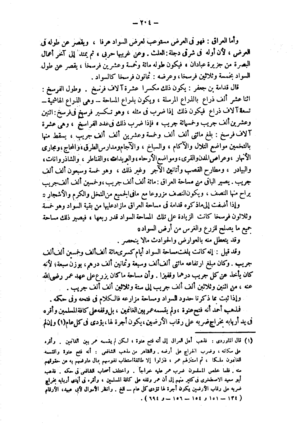 وَطُولُ الْفَرْسَخِ: اثْنَا عَشَرَ أَلْفِ ذِرَاعٍ بِالذِّرَاعِ الْمُرْسَلَةِ، وَيَكُونُ بِذِرَاعِ الْمِسَاحَةِ – وَهِيَ الذِّرَاعُ الْهَاشِمِيَّةُ – تِسْعَةَ آلَافِ ذِرَاعٍ فيكون ذلك إذا ضرب في مثله، وهو تَكْسِيرُ فَرْسَخٍ فِي فَرْسَخِ: اثْنَيْنِ وَعِشْرِينَ أَلْفَ جَرِيبٍ وَخَمْسِمِائَةِ جَرِيبٍ، فَإِذَا ضُرِبَ ذَلِكَ فِي عَدَدِ الْفَرَاسِخِ، وَهِيَ عَشَرَةُ آلَافِ فَرْسَخٍ: بَلَغَ مِائَتَيْ أَلْفِ أَلْفٍ وَخَمْسَةً وَعِشْرِينَ أَلْفَ أَلْفِ جَرِيبٍ، يَسْقُطُ مِنْهَا بِالتَّخْمِينِ مَوَاضِعُ التِّلَالِ وَالْآكَامِ، والسباخ، والآجام ومدارس الطرق والمحاج، ومجاري الانهار، وعراص المدن والقرى، ومواضع الأرحاء، والبريدات والقناطر، والشاذروانات، والبيادر، ومطارح القصب وأتانين الآجر وغير ذلك، وَهُوَ خَمْسَةٌ وَسَبْعُونَ أَلْفَ أَلْفِ جَرِيبٍ يَصِيرُ الْبَاقِي مِنْ مِسَاحَةِ الْعِرَاقِ: مِائَةَ أَلْفِ أَلْفٍ جريب، وخمسين وسبعون أَلْفَ أَلْفِ جَرِيبٍ يُرَاحُ مِنْهَا النِّصْفُ، وَيَكُونُ النِّصْفُ مَزْرُوعًا مَعَ مَا فِي الْجَمِيعِ مِنْ المخل والكرم والأشجار. وإذا أضاف إلَى مَا ذَكَرَهُ قُدَامَةُ فِي مِسَاحَةِ الْعِرَاقِ ما زاد عليها من بَقِيَّةَ السَّوَادِ وَهُوَ خَمْسَةٌ وَثَلَاثُونَ فَرْسَخًا كَانَتْ الزيادة على تلك المساحة السواد قَدْرَ رُبْعِهَا، فَيَصِيرُ ذَلِكَ مِسَاحَةَ جَمِيعِ مَا يصلح للزرع والغرس من أرض السواد. وَقَدْ يَتَعَطَّلُ مِنْهُ بِالْعَوَارِضِ وَالْحَوَادِثِ مَا لَا ينحصر. وقد قيل: إنه كانت بلغت مساحة السواد أيام كسرى مائة ألف ألف وخمسين ألف ألف جريب، وكان مبلغ ارتفاعه مائتي ألف ألف وسبعة وثمانين أَلْفِ دِرْهَمٍ، بِوَزْنِ سَبْعَةٍ، لِأَنَّهُ كَانَ يَأْخُذُ عن كل جريب درهما وقفيزا، وأن مساحة ما كان يزرع عَلَى عَهْدِ عُمَرَ رَضِيَ اللَّهُ عَنْهُ، مِنْ اثْنَيْنِ وَثَلَاثِينَ أَلْفَ أَلْفِ جَرِيبٍ إلَى سِتَّةٍ وثلاثين ألف ألف جريب. وإذا ثبت بما ذكرنا حدود السواد ومساحة مزارعه فالكلام في فتحه وفي حكمه.