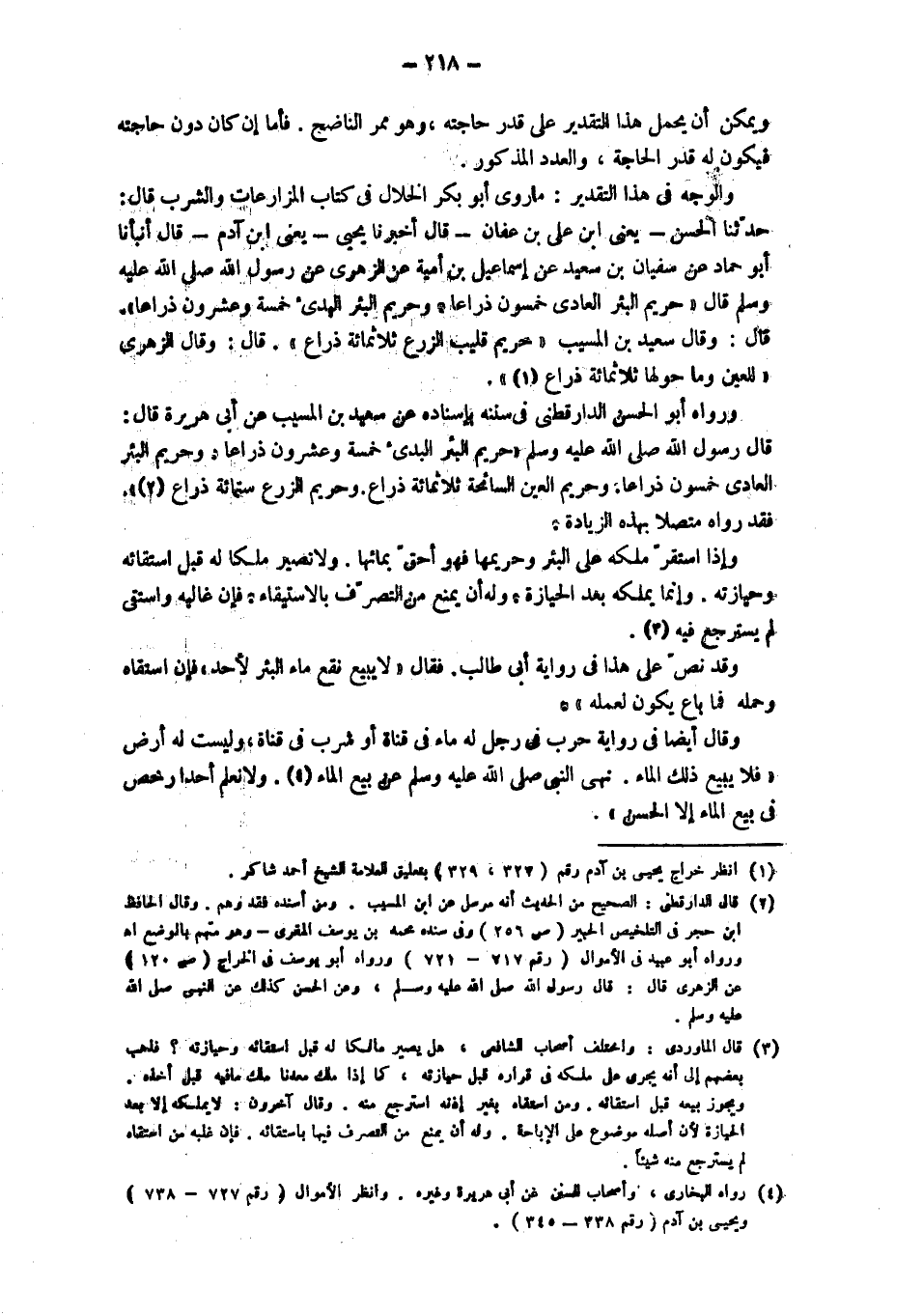 ويمكن أن يحمل هذا التقدير على قدر حاجته، وهو ممر الناضح، فأما إن كان دون حاجته فيكون له قدر الحاجة، والعدد المذكور. والوجه في هذا التقدير: ما روى أبو بكر الخلال في كتاب المزارعات والشرب قال: حدثنا الحسن - يعني ابن علي بن عفان - قال أخبرنا يحيى - يعني ابن آدم - قال أبنأنا أبو حماد عن سفيان بن سعيد عن إسماعيل بن أمية عن الزهري عَنْ رَسُولِ اللَّهِ - صَلَّى اللَّهُ عَلَيْهِ وَسَلَّمَ - قال: " حريم البئر العادي خمسون ذراعا، وحريم البئر الهدئ خمسة وعشرون ذراعا". قال: وقال سعيد بن المسيب " حريم قليب الزرع ثلاثمائة ذراع". قال: وقال الزهري " للعين وما حولها ثلاثمائة ذراع". ورواه أبو الحسن الدارقطني في سننه بإسناده عن سعيد بن المسيب عَنْ أَبِي هُرَيْرَةَ قَالَ: قَالَ رَسُولُ اللَّهِ - صلى الله عليه وسلم - " حريم البئر البدئ خمسة وعشرون ذراعا، وحريم البئر العادي خمسون ذراعا، وحريم العين السائحة ثلاثمائة ذراع، وحريم الزرع ستمائة ذراع".