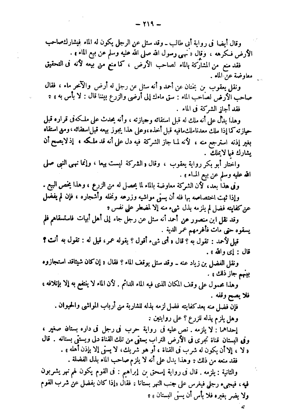 وقال أيضا في رواية أبي طالب - وقد سئل عن الرجل يكون له الماء فيشارك صاحب الأرض كرهه، وقال " نهى رسول الله - صلى الله عليه وسلم - عن بيع الماء". فقد منع من المشاركة بالماء لصاحب الأرض، كما منع من بيعه لأنه في التحقيق معاوضة عن الماء. ونقل يعقوب بن بختان عن أحمد " أنه سئل عن رجل له أرض والآخر ماء، فقال صاحب الأرض لصاحب الماء: سق ماءك إلى أرضي والزرع بيننا قال: لا بأس به". فقد أجاز الشركة في الماء. وهذا يدل على أنه ملك له قبل استقائه وحيازته، وأنه يحدث عَلَى مِلْكِهِ فِي قَرَارِهِ قَبْلَ حِيَازَتِهِ كَمَا إذَا مَلَكَ مَعْدِنًا مَلَكَ مَا فِيهِ قَبْلَ أخذه، وعلى هذا يجوز قبل استقائه، ومن استقاه بغير إذنه استرجع منه، لأنه لما جاز الشركة فيه دل على أنه قد ملكه، وإذا لا يصح أن يشارك فيما لا يملك. واختار أبو بكر رواية يعقوب، وقال " الشركة ليست بيعا، وإنما نهى النبي - صلى الله عليه وسلم - عن بيع الماء". وفي هذا بعد، لأن الشركة معاوضة بالماء لما يحصل له من الزرع، وهذا يختص البيع. وإذا ثبت اختصاصه بها فله أن يسقي مواشيه وزرعه ونخله وَأَشْجَارِهِ، فَإِنْ لَمْ يَفْضُلْ عَنْ كِفَايَتِهِ فَضْلٌ لم يلزمه بذل شيء منه إلا لمضطر على نفس. وقد نقل ابن منصور عن أحمد أنه سئل عن رجل جاء إلى أهل أبيات فَاسْتَسْقَاهُمْ فَلَمْ يَسْقُوهُ حَتَّى مَاتَ فَأَغْرَمَهُمْ عُمَرُ الدية.