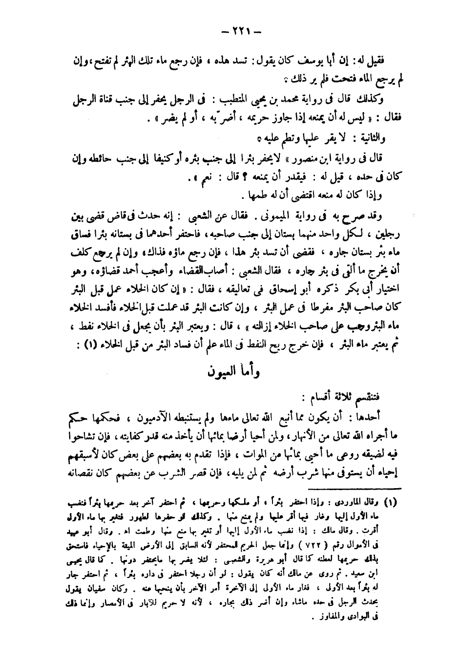 قال في رواية ابن منصور " لا يحفر بئرا إلى جنب بئره أو كنيفا إلى جنب حائطه وإن كان في حده، قيل له: فيقدر أن يمنعه؟ قال: نعم". وإذا كان له منعه اقتضى أن له طمها. وقد صرح به في رواية الميموني: فقال عن الشعبي: إنه حدث في قاض قضى بين رجلين، لكل واحد منهما بستان إلى جنب صاحبه، فاحتفر أحدهما في بستانه بئرا فساق ماء بئر جاره، فقضى أن تسد بئر هذا، فإن رجع ماؤه فذاك، وإن لم يرجع كلف أن يخرج ما ألقى في بئر جاره، فقال الشعبي: أصاب القضاء وأعجب أحمد قضاؤه، وهو اختيار أبي بكر ذكره أبو إسحاق في تعاليقه، فقال: " إن كان الخلاء عمل قبل البئر كان صاحب البئر مفرطا في عمل البئر، وإن كانت البئر قد عملت قبل الخلاء فأفسد الخلاء، ماء البئر وجب على صاحب الخلاء إزالته". قال: ويعتبر البئر بأن يجعل في الخلاء نقط، ثم يعتبر ماء البئر، فإن خرج ريح النفط في الماء علم أن فساد البئر من قبل الخلاء. وَأَمَّا الْعُيُونُ فَتَنْقَسِمُ ثَلَاثَةَ أَقْسَامٍ: أَحَدُهَا: أَنْ يَكُونَ مِمَّا أَنَبَعَ اللَّهُ تَعَالَى مَاءَهَا وَلَمْ يَسْتَنْبِطْهُ الْآدَمِيُّونَ، فَحُكْمُهَا حُكْمُ مَا أَجْرَاهُ اللَّهُ تَعَالَى مِنْ الْأَنْهَارِ، وَلِمَنْ أَحْيَا أَرْضًا بِمَائِهَا أَنْ يَأْخُذَ مِنْهُ قَدْرَ كِفَايَتِهِ، فَإِنْ تَشَاحُّوا فِيهِ لِضِيقِهِ رُوعِيَ مَا أُحْيِيَ بِمَائِهَا مِنْ الموات، فإذا تقدم به بَعْضُهُمْ عَلَى بَعْضٍ كَانَ لِأَسْبَقِهِمْ إحْيَاءً أَنْ يَسْتَوْفِيَ مِنْهَا شُرْبَ أَرْضِهِ ثُمَّ لِمَنْ يَلِيهِ، فَإِنْ قَصُرَ الشُّرْبُ عَنْ بَعْضِهِمْ كَانَ نُقْصَانُهُ
