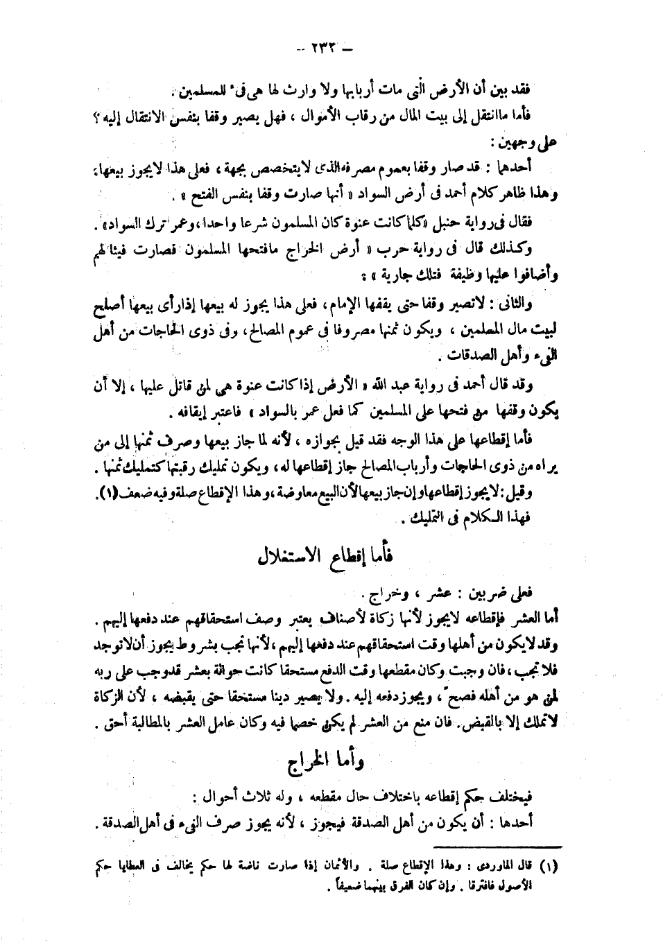 فأما إقْطَاعُهَا عَلَى هَذَا الْوَجْهِ فَقَدْ قِيلَ بِجَوَازِهِ، لِأَنَّهُ لَمَّا جَازَ بَيْعُهَا وَصَرْفُ ثَمَنِهَا إلَى مَنْ يَرَاهُ مِنْ ذَوِي الْحَاجَاتِ وَأَرْبَابِ الْمَصَالِحِ جَازَ إقْطَاعُهَا لَهُ، وَيَكُونُ تَمْلِيكُ رَقَبَتِهَا كَتَمْلِيكِ ثمنها. وقيل: لا يجوز إقطاعها وَإِنْ جَازَ بَيْعُهَا لِأَنَّ الْبَيْعَ مُعَاوَضَةٌ، وَهَذَا الإقطاع صلة وفيه ضعف فهذا الكلام في التمليك. وَأَمَّا الْخَرَاجُ فَيَخْتَلِفُ حُكْمُ إقْطَاعِهِ بِاخْتِلَافِ حَالِ مقطعه، وله ثلاث أحوال: أحدها: أن يكون من أهل الصدقة فيجوز، لأنه صرف الفيء في أهل الصدقة.