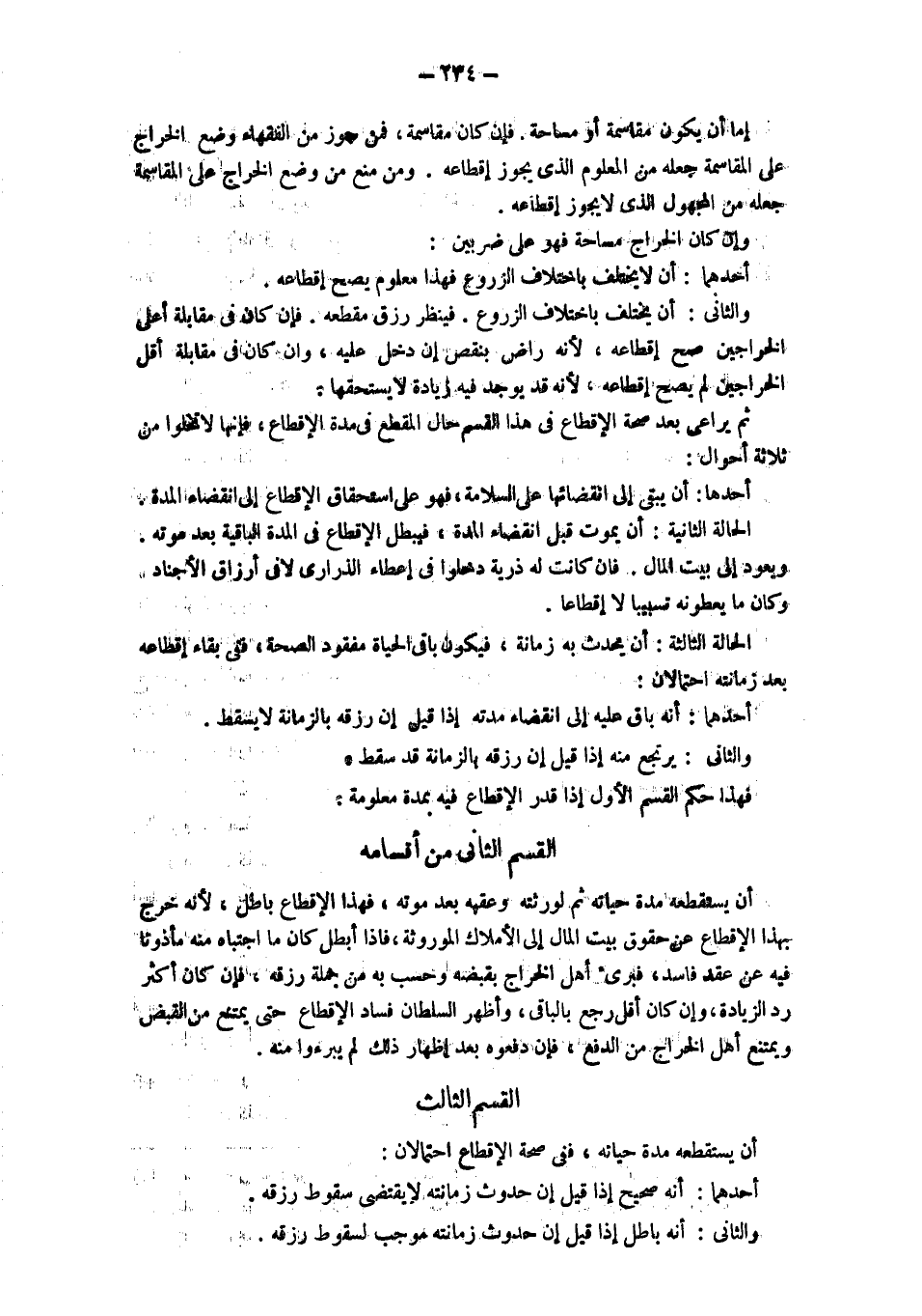 القسم الثَّانِي مِنْ أَقْسَامِهِ أَنْ يَسْتَقْطِعَهُ مُدَّةَ حَيَاتِهِ ثم لورثته وعقبه بعد موته، فهذا الإقطاع باطل، لأنه خرج بهذا الإقطاع عن حقوق بيت المال إلى الأملاك الموروثة، فإذا أبطل كَانَ مَا اجْتَبَاهُ مِنْهُ مَأْذُونًا فِيهِ عَنْ عقد فاسد، فبرئ أهل الخراج بقبضه وحسب به مِنْ جُمْلَةِ رِزْقِهِ، فَإِنْ كَانَ أَكْثَرَ رَدَّ الزيادة، وإن كان أقل بالباقي، وأظهر السلطان فساد الإقطاع حتى يمتنع ن القبض ويمتنع أَهْلُ الْخَرَاجِ مِنْ الدَّفْعِ، فَإِنْ دَفَعُوهُ بَعْدَ إظهار ذلك لم يبرءوا منه. القسم الثَّالِثُ أَنْ يَسْتَقْطِعَهُ مُدَّةَ حَيَاتِهِ، فَفِي صِحَّةِ الإقطاع احتمالان: أحدهما: أنه صحيح إذا قِيلَ إنَّ حُدُوثَ زَمَانَتِهِ لَا يَقْتَضِي سُقُوطَ رزقه. والثاني: أنه باطل إذا قيل إن حدوث زمانته موجب لسقوط رزقه.
