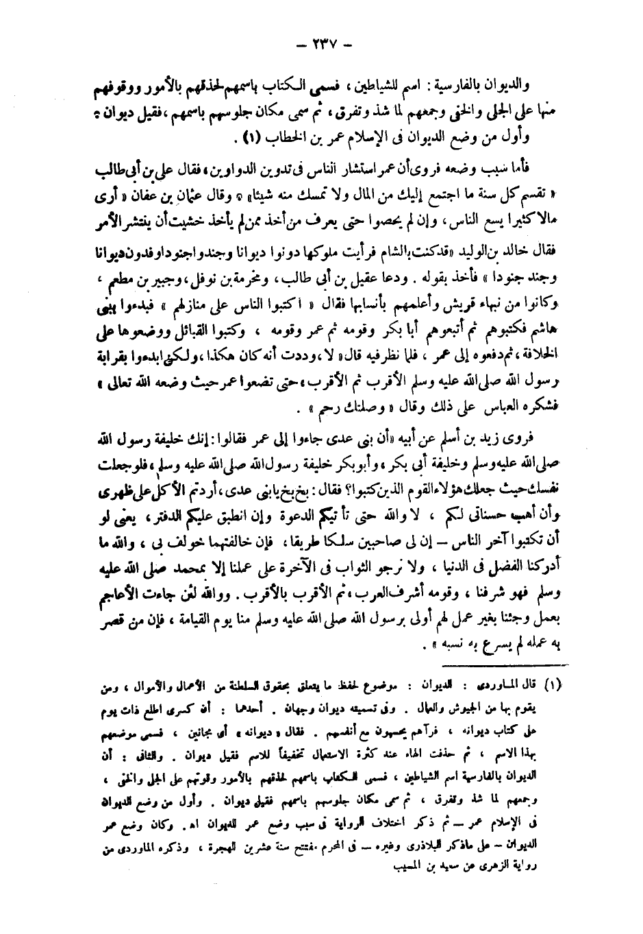 والديوان بالفارسية: اسم للشياطين، فسمي الكتاب باسمهم لحذقهم بالأمور ووقوفهم منها عَلَى الْجَلِيِّ وَالْخَفِيِّ وَجَمْعِهِمْ لِمَا شَذَّ وَتَفَرَّقَ، ثُمَّ سُمِّيَ مَكَانُ جُلُوسِهِمْ بِاسْمِهِمْ، فَقِيلَ دِيوَانٌ. وَأَوَّلُ مَنْ وَضَعَ الدِّيوَانَ فِي الْإِسْلَامِ عُمَرُ بن الخطاب. فأما سبب وضعه فروى أن عمر استشار الناس في تدوين الدواوين، فقال علي بن أبي طالب " تُقَسِّمُ كُلَّ سَنَةٍ مَا اجْتَمَعَ إلَيْكَ مِنْ الْمَالِ وَلَا تُمْسِكْ مِنْهُ شَيْئًا " وَقَالَ عُثْمَانُ بن عفان " أرى مالا كثيرا يسع الناس، وإن لَمْ يُحْصُوا حَتَّى يُعْرَفَ مَنْ أَخَذَ مِمَّنْ لم يأخذ حشيت أَنْ يَنْتَشِرَ الْأَمْرُ فَقَالَ خَالِدُ بْنُ الْوَلِيدِ " قد كنت بالشام فرأيت ملوكها دَوَّنُوا دِيوَانًا وَجَنَّدُوا جُنُودًا فَدَوِّنْ دِيوَانًا وَجَنِّدْ جُنُودًا" فَأَخَذَ بِقَوْلِهِ. وَدَعَا عَقِيلَ بْنَ أَبِي طَالِبٍ، وَمَخْرَمَةَ بْنَ نَوْفَلٍ، وَجُبَيْرَ بْنَ مُطْعِمٍ، وكانوا من نبهاء قريش وأعلمهم بأنسابهم فقال " اُكْتُبُوا النَّاسَ عَلَى مَنَازِلِهِمْ " فَبَدَءُوا بِبَنِي هَاشِمٍ فَكَتَبُوهُمْ ثُمَّ أَتْبَعُوهُمْ أَبَا بَكْرٍ وَقَوْمَهُ ثُمَّ عُمَرَ وَقَوْمَهُ، وَكَتَبُوا الْقَبَائِلَ وَوَضَعُوهَا عَلَى الْخِلَافَةِ، ثم دفعوه إلَى عُمَرَ، فَلَمَّا نَظَرَ فِيهِ قَالَ: " لَا، وَدِدْتُ أَنَّهُ كَانَ هَكَذَا، وَلَكِنْ ابْدَءُوا بِقَرَابَةِ رَسُولِ اللَّهِ - صَلَّى اللَّهُ عَلَيْهِ وَسَلَّمَ - الْأَقْرَبَ ثم الأقرب، حتى تضعوا عمر حيث وضعه الله تعالى، فشكره العباس على ذلك وقال " وصلتك رحم".