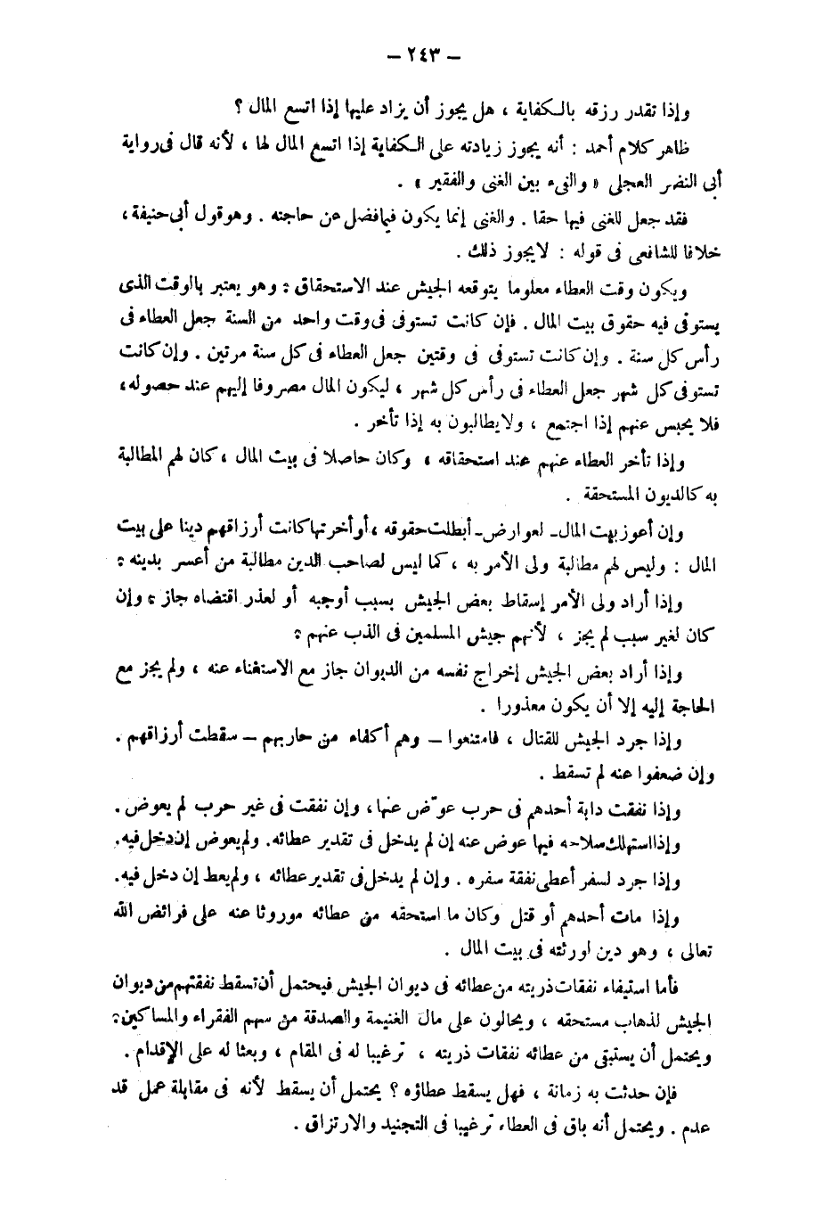 وإذا تَقَدَّرَ رِزْقُهُ بِالْكِفَايَةِ، هَلْ يَجُوزُ أَنْ يُزَادَ عليها إذا اتسع المال؟ ظاهر كلام أحمد: أنه يجوز زِيَادَتَهُ عَلَى الْكِفَايَةِ إذَا اتَّسَعَ الْمَالُ لَهَا، لأنه قال في رواية أبي النضر العجلي: " والفيء بين الغني والفقير". فقد جعل للغني فيها حقا، والغني إنما يكون فيما فضل عن حاجته، وهو قول أبي حنيفة، خلافا للشافعي في قوله: لا يجوز ذلك. وَيَكُونُ وَقْتُ الْعَطَاءِ مَعْلُومًا يَتَوَقَّعُهُ الْجَيْشُ عِنْدَ الاستحقاق. وهو معتبر بالوقت الذي يستوفي فِيهِ حُقُوقُ بَيْتِ الْمَالِ. فَإِنْ كَانَتْ تُسْتَوْفَى فِي وَقْتٍ وَاحِدٍ مِنْ السَّنَةِ جُعِلَ الْعَطَاءُ فِي رَأْسِ كُلِّ سَنَةٍ، وَإِنْ كَانَتْ تُسْتَوْفَى فِي وَقْتَيْنِ جُعِلَ الْعَطَاءُ فِي كُلِّ سَنَةٍ مرتين.
