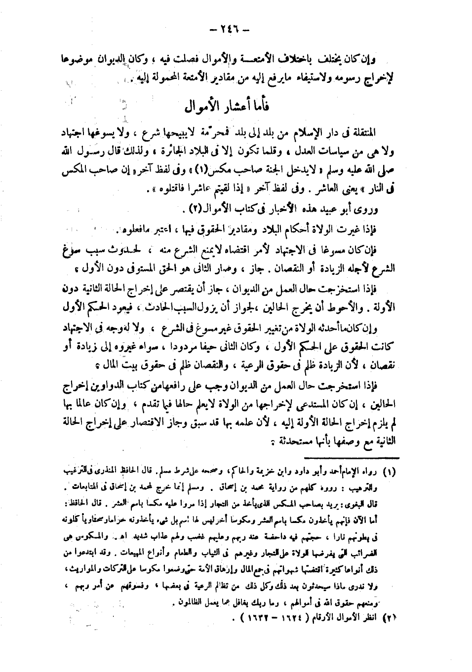 وإن كَانَ يَخْتَلِفُ بِاخْتِلَافِ الْأَمْتِعَةِ وَالْأَمْوَالِ فُصِلَتْ فِيهِ، وَكَانَ الدِّيوَانُ مَوْضُوعًا لِإِخْرَاجِ رُسُومِهِ وَلِاسْتِيفَاءِ مَا يُرْفَعُ إلَيْهِ مِنْ مَقَادِيرِ الْأَمْتِعَةِ الْمَحْمُولَةِ إلَيْهِ. فأما أَعْشَارُ الْأَمْوَالِ الْمُنْتَقِلَةِ فِي دَارِ الْإِسْلَامِ مِنْ بَلَدٍ إلَى بَلَدٍ فَمُحَرَّمَةٌ لَا يُبِيحُهَا شَرْعٌ، وَلَا يُسَوِّغُهَا اجْتِهَادٌ وَلَا هِيَ مِنْ سِيَاسَاتِ العدل، وقلما تكون إلا في البلاد الجائرة، ولذلك قَالَ رَسُولُ اللَّهِ - صَلَّى اللَّهُ عَلَيْهِ وَسَلَّمَ - " لا يدخل الجنة صاحب مكس " وفي لفظ آخر " إن صاحب المكس في النار " يعني العاشر. وفي لفظ آخر" إذا لقيتم عاشرا فاقتلوه". وروي أبو عبيدة هذه الأخبار في كتاب الأموال. فإذا غَيَّرَتْ الْوُلَاةُ أَحْكَامَ الْبِلَادِ وَمَقَادِيرَ الْحُقُوقِ فِيهَا، اُعْتُبِرَ مَا فَعَلُوهُ. فَإِنْ كَانَ مُسَوِّغًا فِي الِاجْتِهَادِ لِأَمْرٍ اقْتَضَاهُ لَا يَمْنَعُ الشَّرْعُ مِنْهُ، لحدوث سبب سوغ الشرع لأجله الزيادة أو النقصان. جَازَ، وَصَارَ الثَّانِي هُوَ الْحَقَّ الْمُسْتَوْفَى دُونَ الأول. فإذا استخرجت حَالُ الْعَمَلِ مِنْ الدِّيوَانِ، جَازَ أَنْ يُقْتَصَرَ على إخراج الحالة الثانية دون الأولة، وَالْأَحْوَطُ أَنْ يُخْرِجَ الْحَالَيْنِ، لِجَوَازِ أَنْ يَزُولَ السَّبَبُ الْحَادِثُ، فَيَعُودَ الْحُكْمُ الْأَوَّلُ. وَإِنْ كَانَ ما أحدثه الْوُلَاةُ مِنْ تَغْيِيرِ الْحُقُوقِ غَيْرَ مُسَوَّغٍ فِي الشَّرْعِ، وَلَا لَهُ وَجْهٌ فِي الِاجْتِهَادِ كَانَتْ الحقوق على الحكم الأول، وكان الثاني حيفا مردودا، سواء غيروه إلى الزيادة أَوْ نُقْصَانٍ، لِأَنَّ الزِّيَادَةَ ظُلْمٌ فِي حُقُوقِ الرَّعِيَّةِ، وَالنُّقْصَانَ ظُلْمٌ فِي حُقُوقِ بَيْتِ الْمَالِ. فإذا استخرجت حال العمل من الديوان وجب على رافعها مِنْ كُتَّابِ الدَّوَاوِينِ إخْرَاجُ الْحَالَيْنِ، إنْ كَانَ الْمُسْتَدْعِي لِإِخْرَاجِهَا مِنْ الْوُلَاةِ لَا يَعْلَمُ حَالَهَا فِيمَا تَقَدَّمَ، وَإِنْ كَانَ عَالِمًا بِهَا لَمْ يلزم إخراج الحالة الأولة إلَيْهِ، لِأَنَّ عِلْمَهُ بِهَا قَدْ سَبَقَ وَجَازَ الاقتصار على إخراج الحالة الثانية مع وصفها بأنها مستحدثة.
