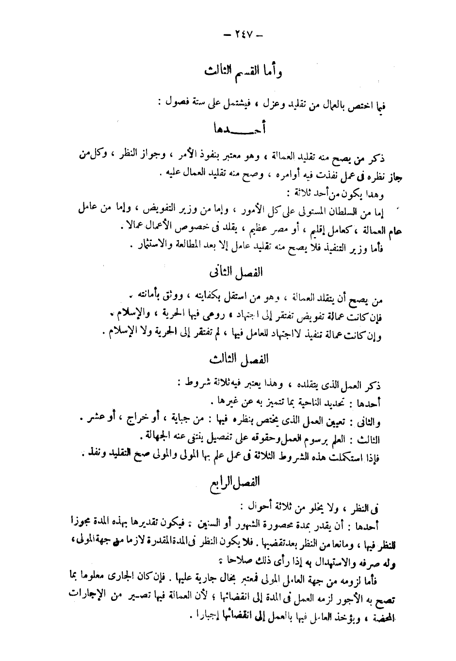 وَأَمَّا الْقِسْمُ الثَّالِثُ فِيمَا اخْتَصَّ بِالْعُمَّالِ مِنْ تَقْلِيدٍ وَعَزْلٍ، فَيَشْتَمِلُ عَلَى سِتَّةِ فُصُولٍ: