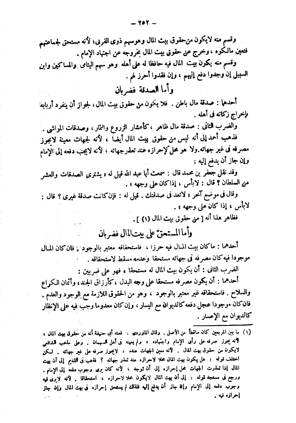وقسم منه لا يكون لَا يَكُونُ مِنْ حُقُوقِ بَيْتِ الْمَالِ وَهُوَ سَهْمُ ذَوِي الْقُرْبَى؛ لِأَنَّهُ مُسْتَحَقٌّ لِجَمَاعَتِهِمْ فَتَعَيَّنَ مالكوه، وخرج عن حقوق بيت المال بخروجه عن اجتهاد الإمام. وقسم منه يكون بيت المال فيه حافظا له على أهله وَهُوَ سَهْمُ الْيَتَامَى وَالْمَسَاكِينِ وَابْنِ السَّبِيلِ إنْ وَجَدُوا دُفِعَ إلَيْهِمْ، وَإِنْ فَقَدُوا أُحْرِزَ لَهُمْ. وأما الصدقة فضربان أحدهما: صَدَقَةُ مَالٍ بَاطِنٍ: فَلَا يَكُونُ مِنْ حُقُوقِ بَيْتِ الْمَالِ لِجَوَازِ أَنْ يَنْفَرِدَ أَرْبَابُهُ بِإِخْرَاجِ زكاته في أهله. وَالضَّرْبُ الثَّانِي: صَدَقَةُ مَالٍ ظَاهِرٍ، كَأَعْشَارِ الزُّرُوعِ والثمار، وصدقات المواشي. فذهب أحمد إلى أنه ليس من حقوق بيت المال أيضا، لأنه لجهات معينة لا يجوز مصرفه في غير جهاته، ولا هو محل لإحرازه عند تعذر جهاته، لأنه لا يجب دَفْعِهِ إلَى الْإِمَامِ وَإِنْ جَازَ أَنْ يُدْفَعَ إليه. وقد نقل جعفر بن محمد قال: سمعت أبا عبد الله قيل له " يشتري الصدقات والعشر من السلطان؟ قال: لا بأس، إذا كان على وجهه".