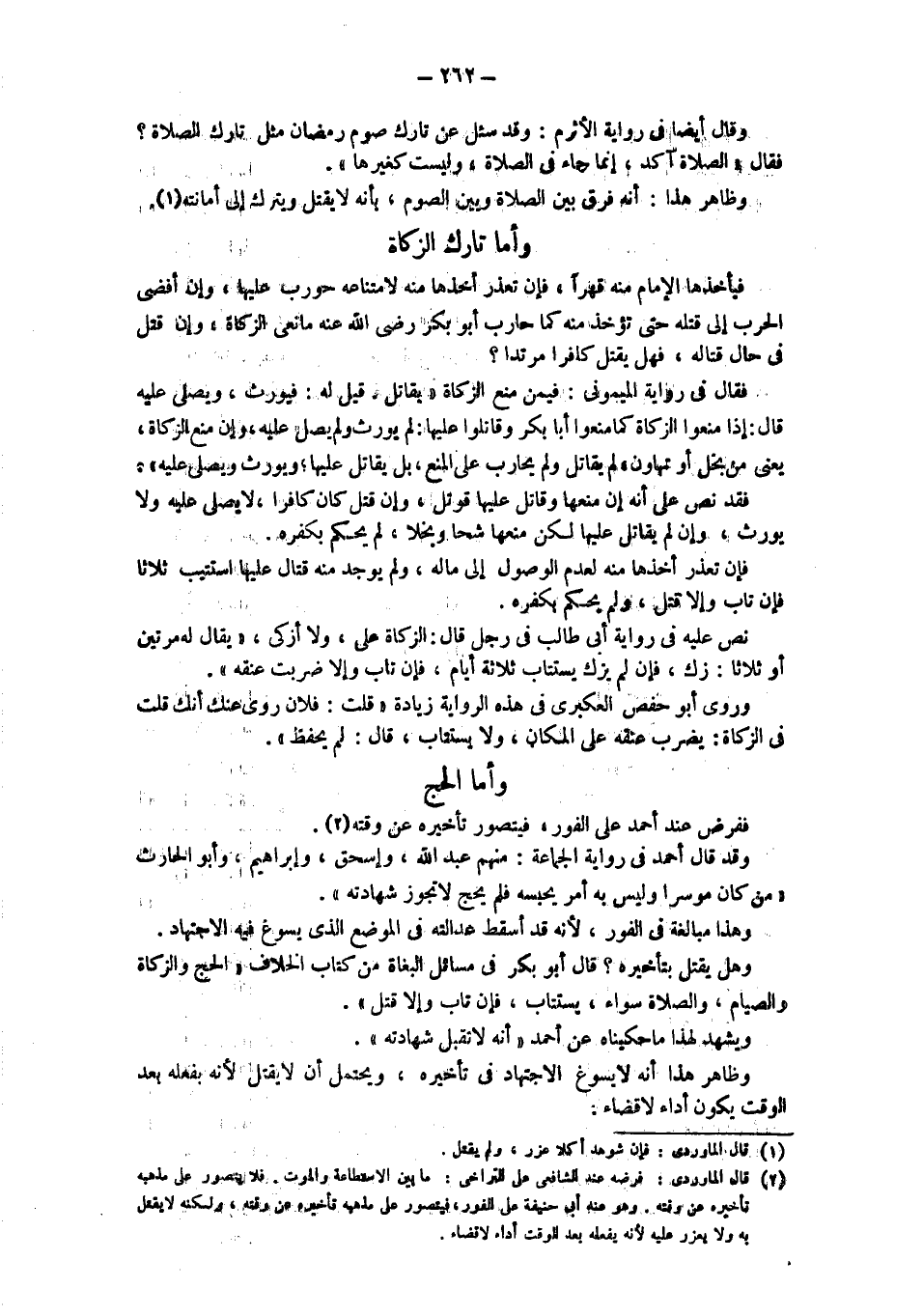 فقد نص على أنه إن منعها وقاتل عليها قوتل، وإن قتل كافرا، لا يصلى عليه ولا يورث، وإن لم يقاتل عليها لكن منعها شحا وبخلا، لم يحكم بكفره. فإن تعذر أخذها منه لعدم الوصول إلى ماله، ولم يوجد منه قتال عليها استتيب ثلاثا فإن تاب وإلا قتل، ولم يحكم بكفره. نص عليه في رواية أبي طالب في رجل قال: الزكاة على، ولا أزكي، " يقال له مرتين أو ثلاثا: زك، فإن لم يزك يستتاب ثلاثة أيام، فإن تاب وإلا ضربت عنقه". وروى أبو حفص العكبري في هذه الرواية زيادة قلت: فلان روى عنك أنك قلت في الزكاة: يضرب عنقه على المكان، ولا يستتاب، قال: لم يحفظ". وما الحج ففرض عند أحمد على الفور، فيتصور تأخيره عن وقته. وقد قال أحمد في رواية الجماعة: منهم عبد الله، وإسحاق، وإبراهيم، وأبو الحارث " ومن كان موسرا وليس به أمر يحبسه فلم يحج لا تجوز شهادته". وهذا مبالغة في الفور، لأنه قد أسقط عدالته في الموضع الذي يسوغ فيه الاجتهاد. وهل يقتل بتأخيره؟ قال أبو بكر في مسائل البغاة من كتاب الخلاف " الحج والزكاة والصيام، والصلاة سواء، يستتاب، فإن تاب وإلا قتل". ويشهد لهذا ما حكيناه عن أحمد " أنه لا تقبل شهادته". وظاهر هذا أنه لا يسوغ الاجتهاد في تأخيره، ويحتمل أن لا يقتل لأنه بفعله بعد الوقت يكون أَدَاءً لَا قَضَاءً.